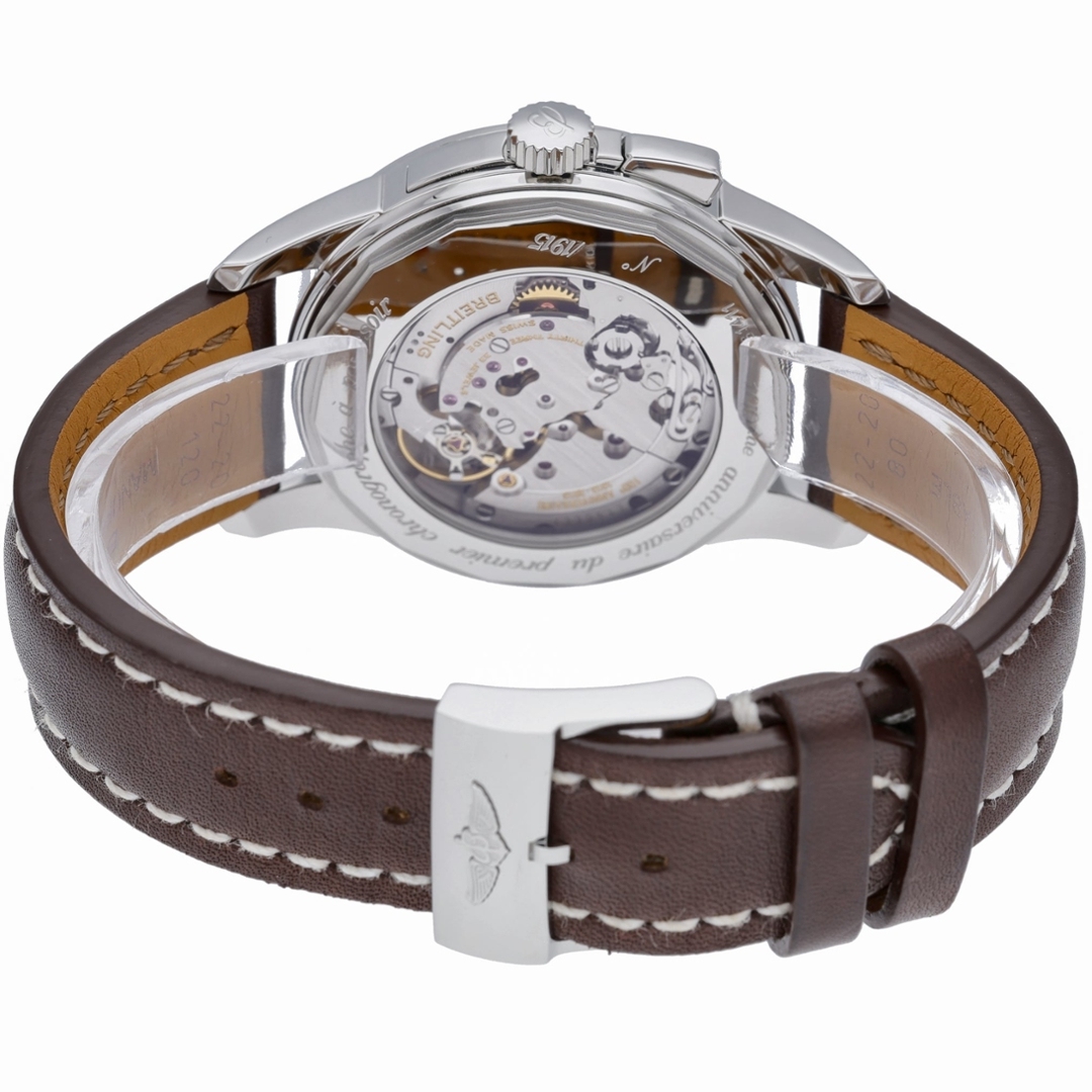 A Breitling Transocean Chronograph 1915 Watch, Brown Leather Strap with a Stainless Steel Case & Clasp on a Silver Dial