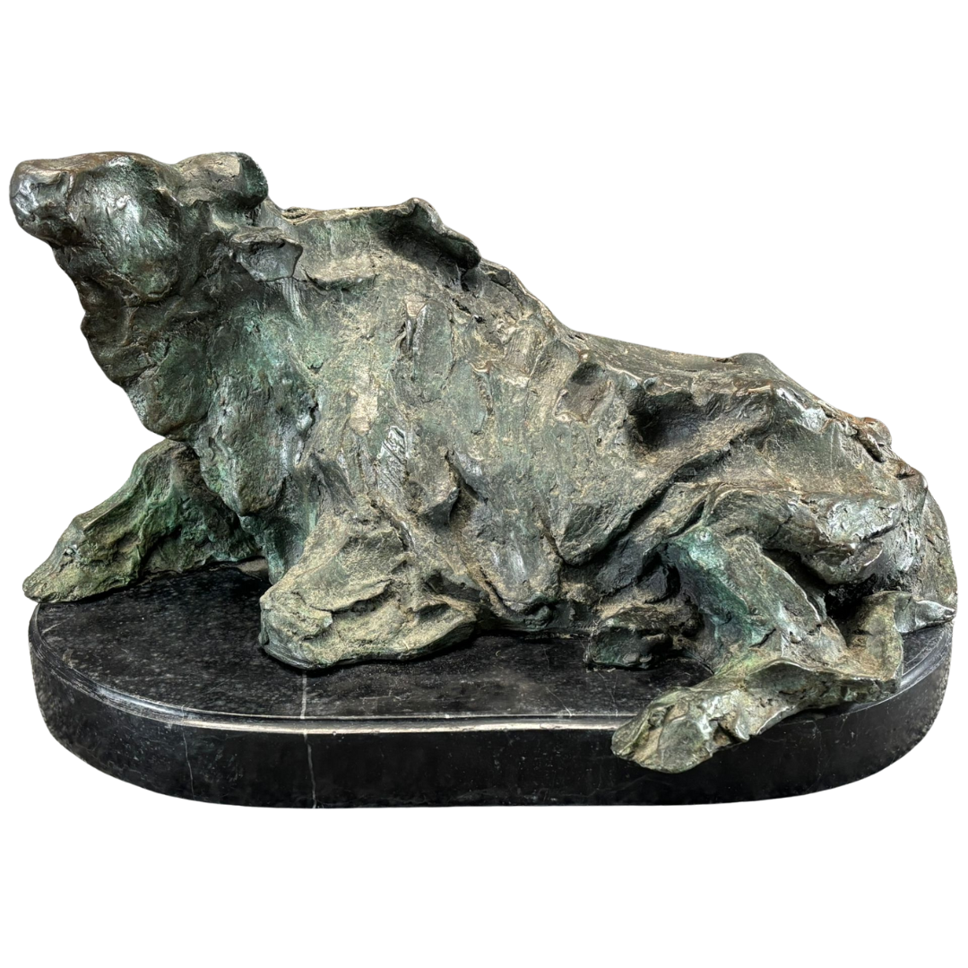A bronze sculpture depicts a powerful bison in repose, rendered with remarkable texture and expressive form. The artist captures the raw strength and enduring presence of this magnificent animal through bold, organic lines that evoke both motion and stillness. The layered surface of the bronze enhances the natural realism, giving the sculpture a sense of vitality and weight.