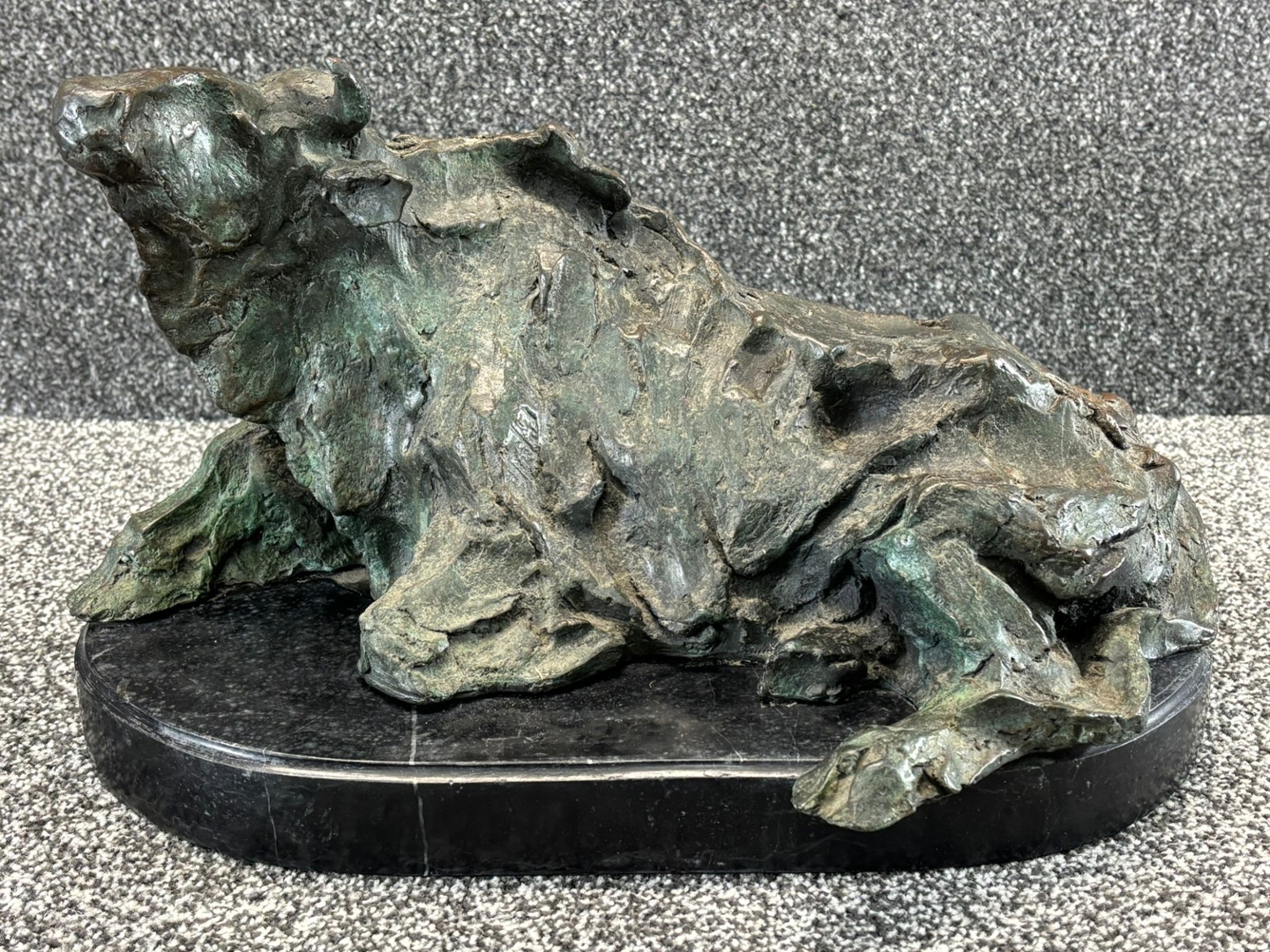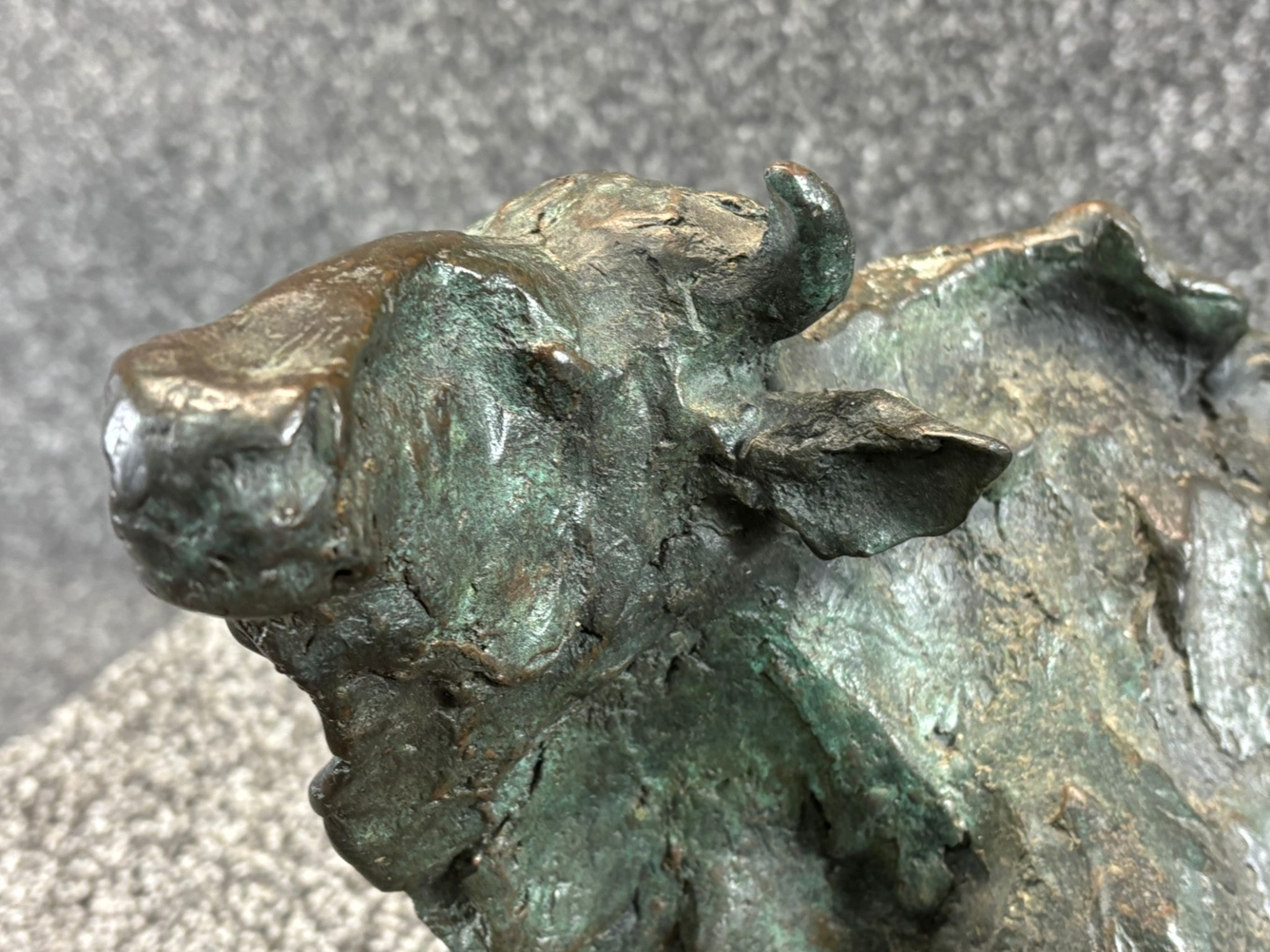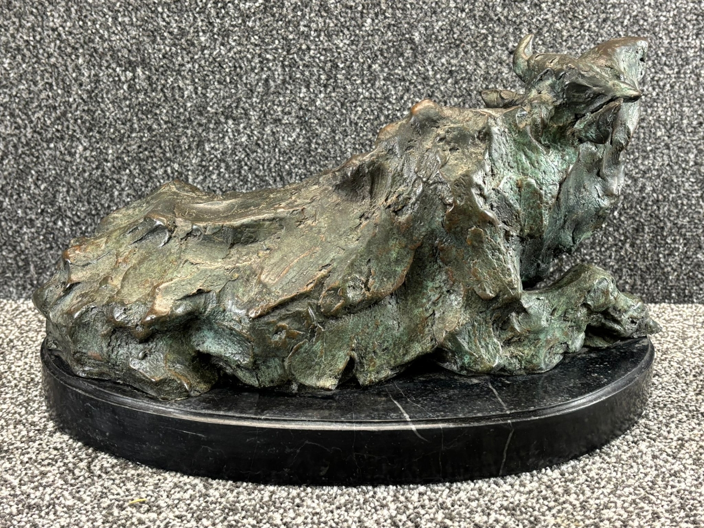 A bronze sculpture of a Bison on a green marble base. Approx 27cm height, 44cm width, 24cm depth.