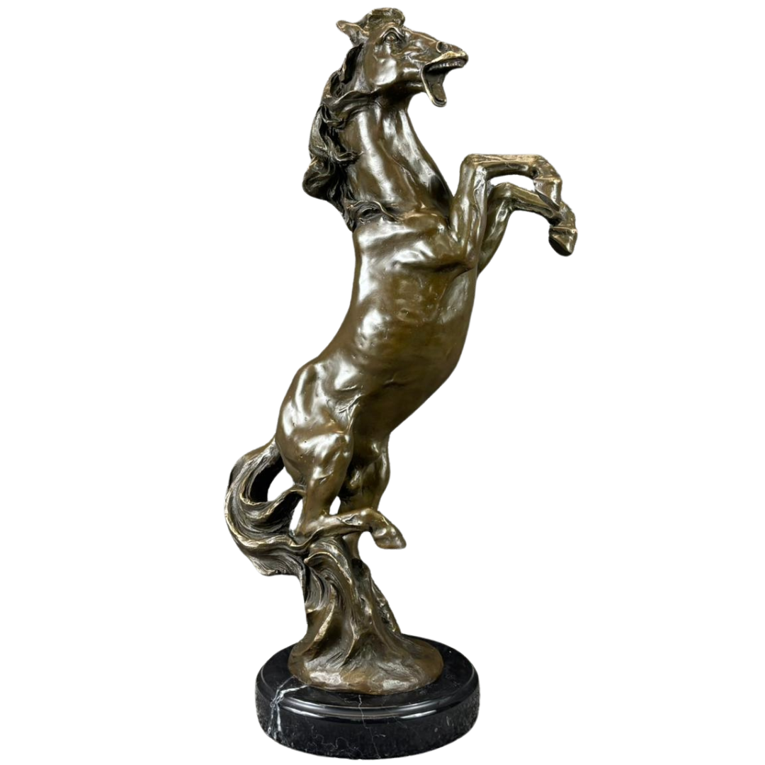 A commanding bronze sculpture of a rearing horse, captured in a moment of raw energy and movement as it rises powerfully on its hind legs. The dynamic pose emphasises strength and vitality, with finely sculpted musculature and flowing mane adding depth and realism. The expressive detailing, from the lifted forelegs to the tension through the body, creates a striking sense of motion and presence.