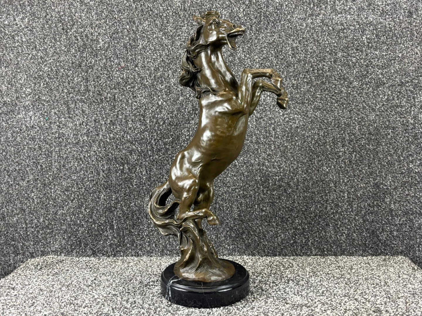 A bronze sculpture of a Rearing Horse on a black base. Approx 46cm height, 25cm width, 15cm depth.