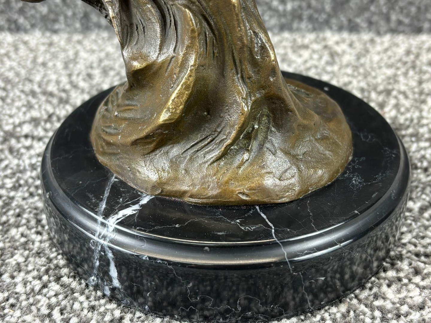Finished in a rich bronze tone, the sculpture is mounted on a circular black base that provides both contrast and stability, enhancing its overall visual impact. Measuring approximately 46cm in height, 25cm in width, and 15cm in depth, it offers an impressive vertical display that naturally draws the eye and commands attention within any setting.