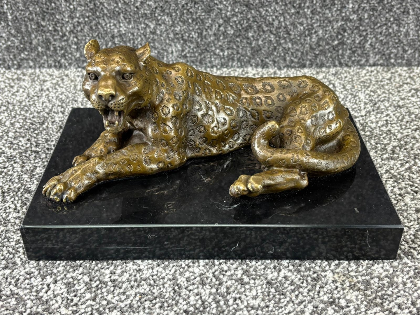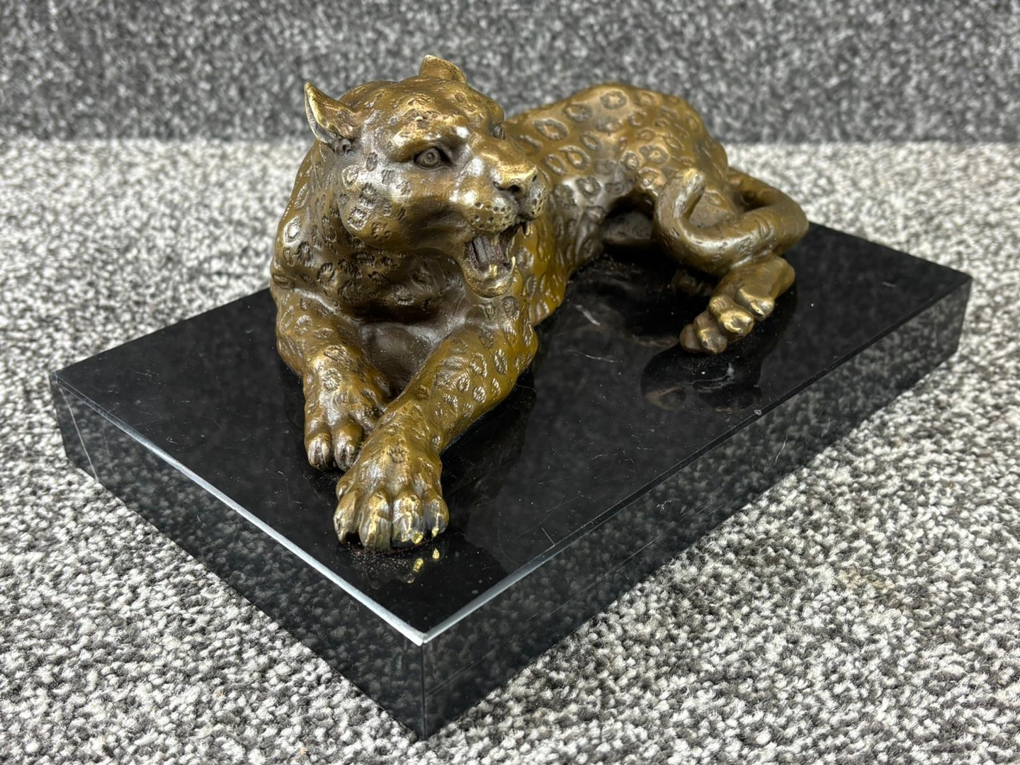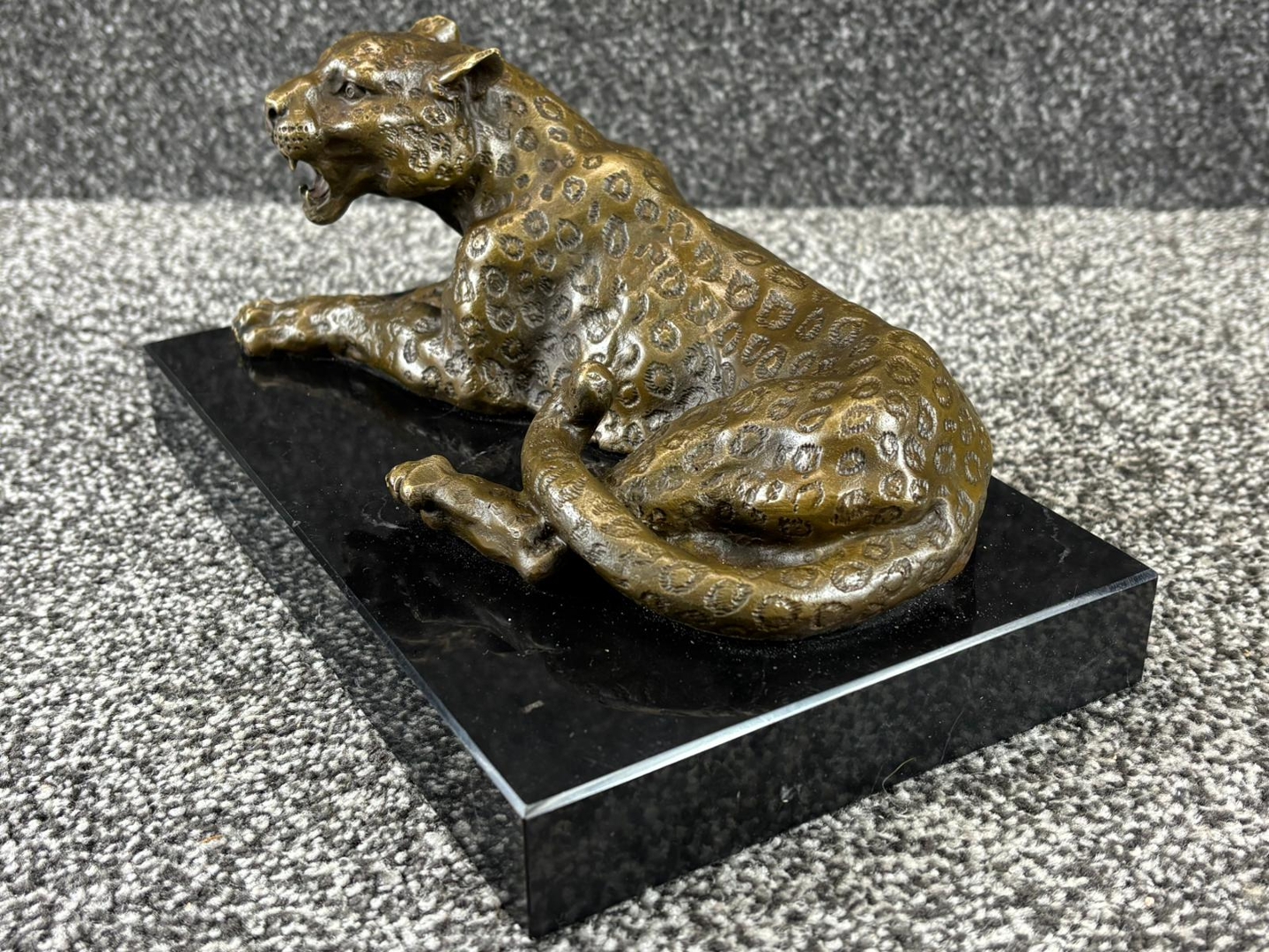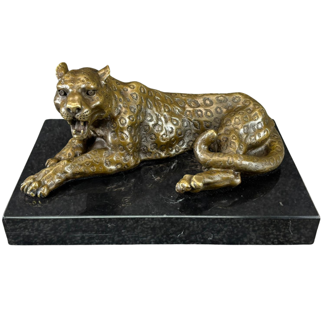 A finely cast bronze sculpture of a reclining leopard, captured in a poised and alert position that conveys both elegance and latent power. The figure is rich in detail, with carefully defined musculature and a textured surface that highlights the animal’s distinctive spotted coat. Its open mouth and focused expression add a sense of tension and realism, bringing the subject vividly to life.