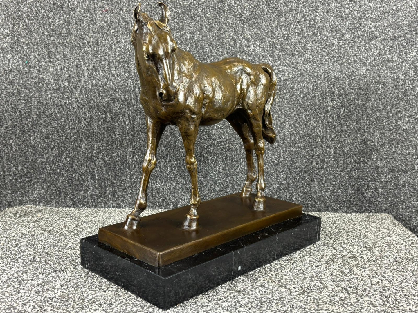 A bronze sculpture of a Standing Horse on a black base. Approx 35cm height, 36cm width, 18cm depth.