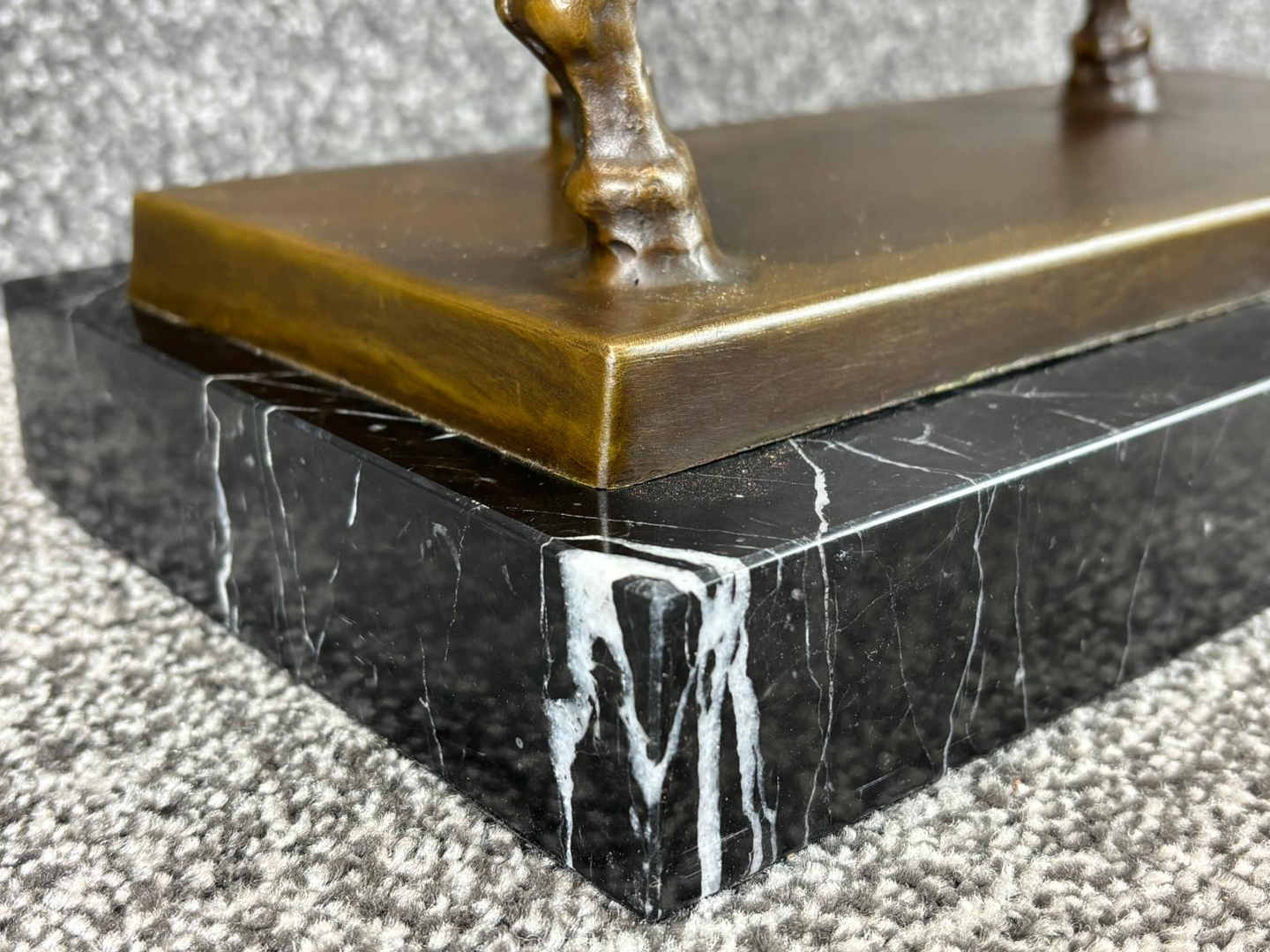 Finished in a warm bronze tone, the sculpture is mounted on a rectangular plinth above a contrasting black base, enhancing its overall presentation. Measuring approximately 35cm in height, 36cm in width, and 18cm in depth, it offers a substantial and well-proportioned display, ideal for a variety of interior settings.