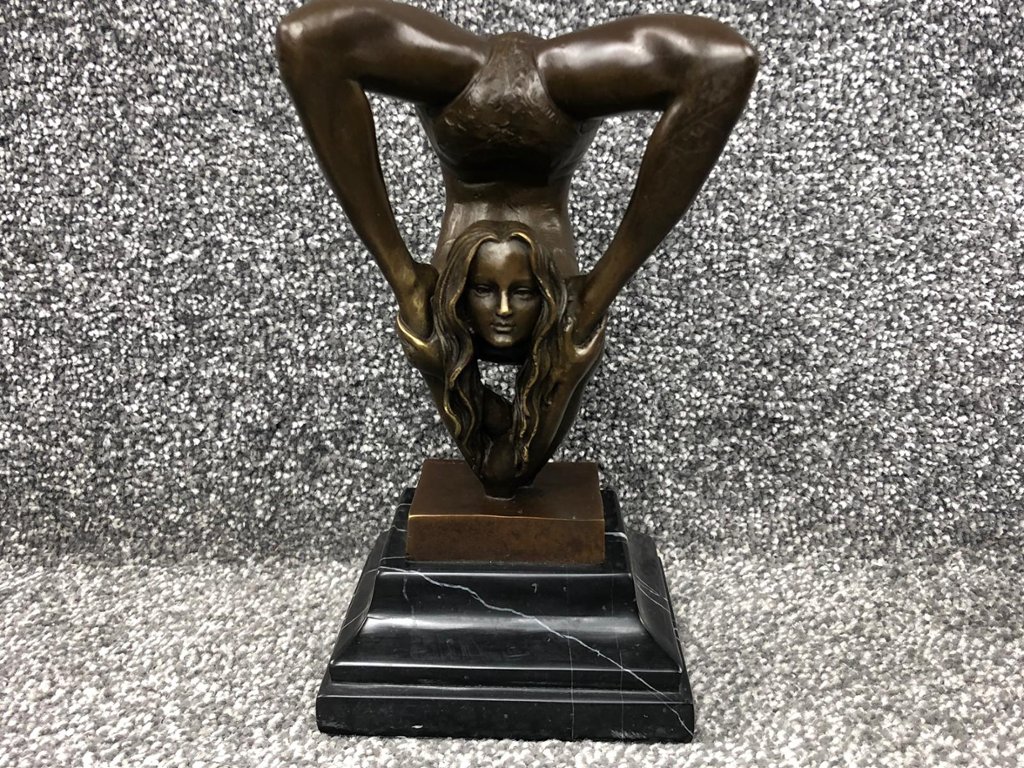 A bronze sculpture of a Lady in a Yoga pose on a black marble base. Approx 9" height.