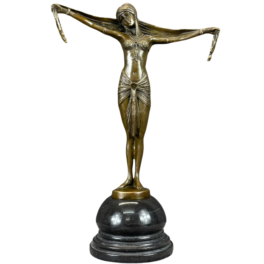 A captivating bronze sculpture of an Art Deco dancer, elegantly posed with outstretched arms, capturing the fluidity and grace synonymous with the period. The figure’s elongated form, stylised features, and poised stance reflect the timeless sophistication of Art Deco design, while intricate detailing across the costume and jewellery adds depth and visual interest.