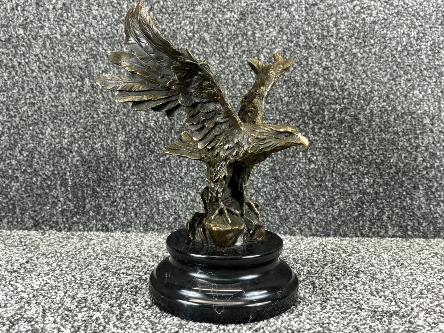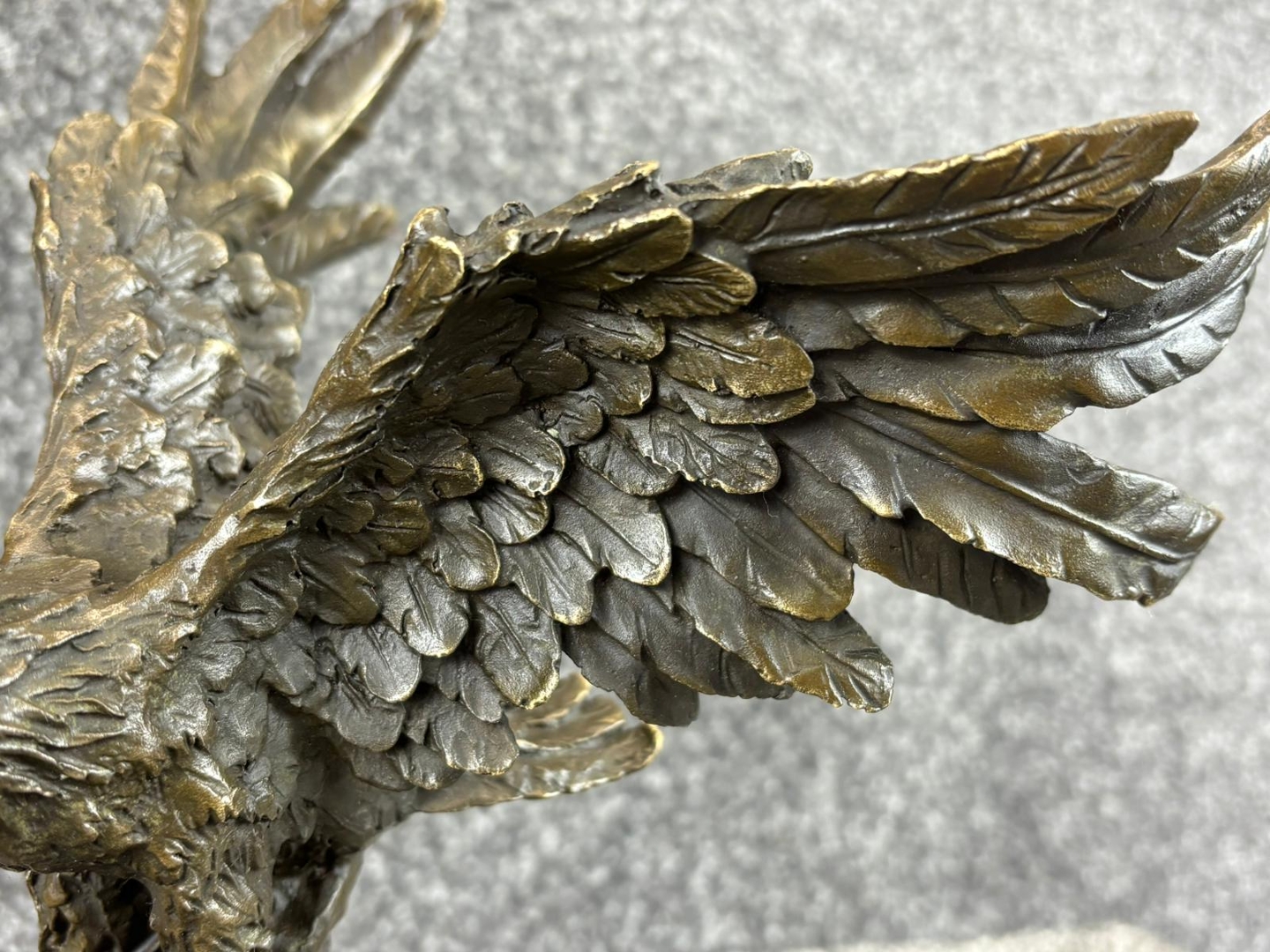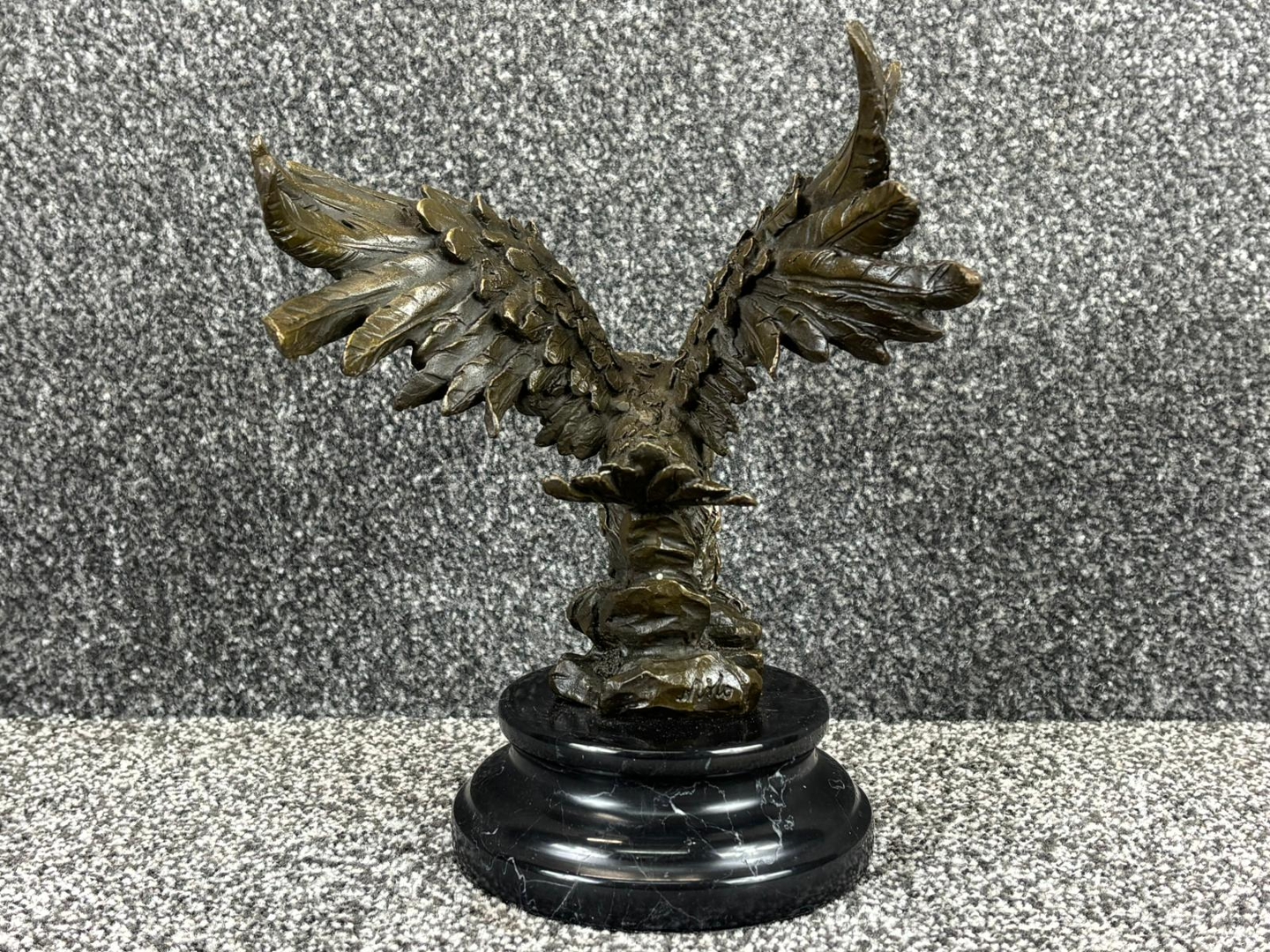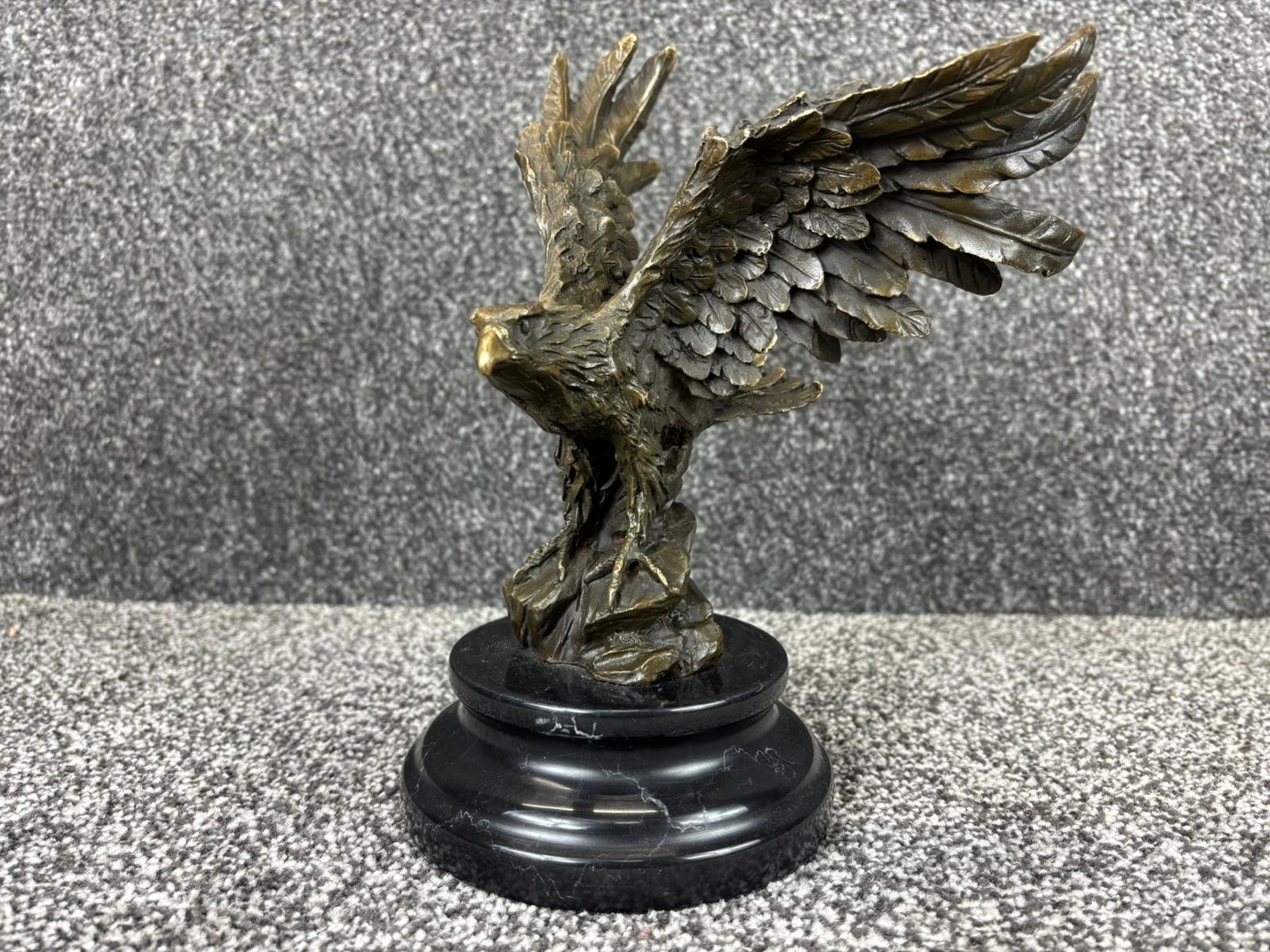 A bronze sculpture of an Eagle in Mid-Ascent on a black base. Approx 23cm height, 19cm width, 15cm depth.
