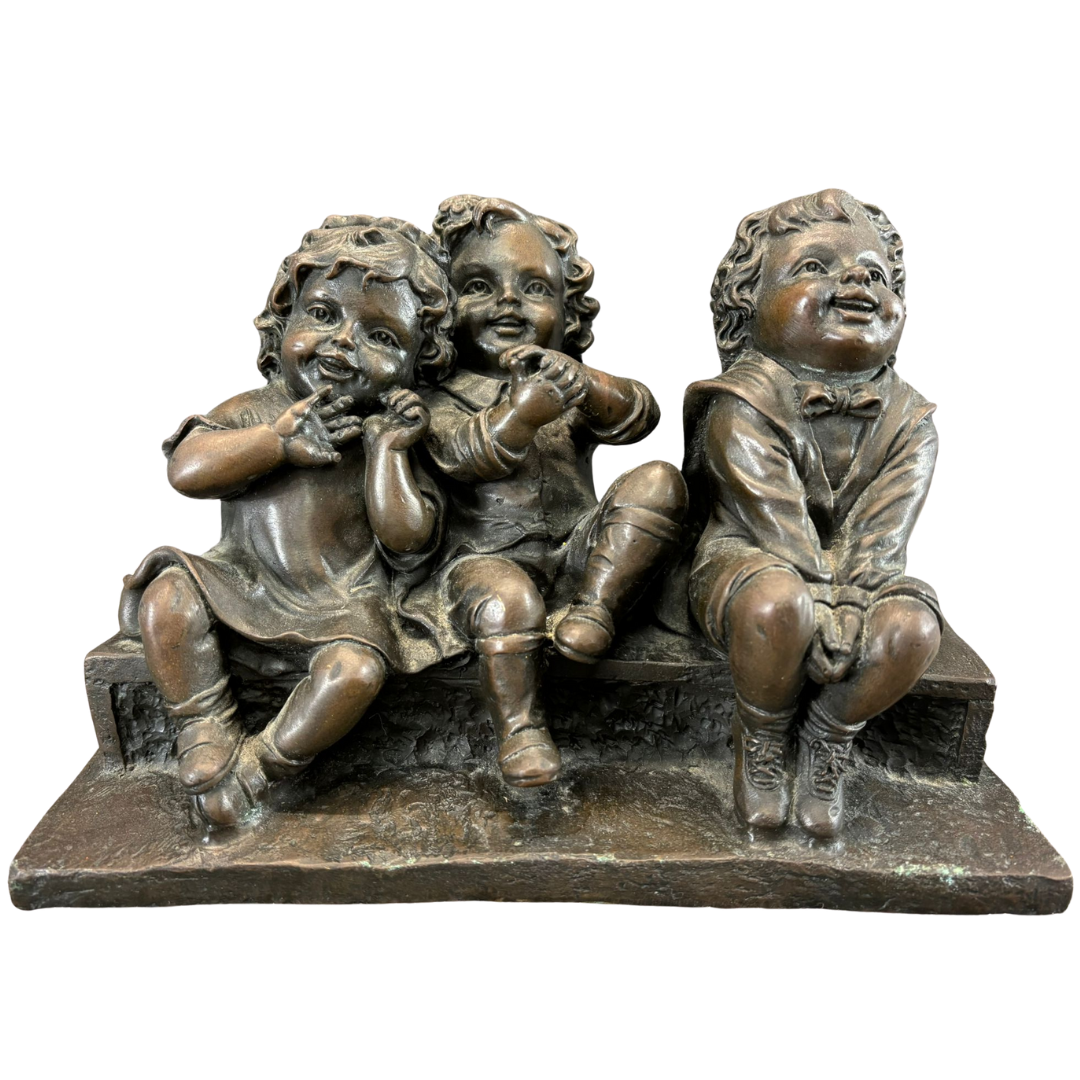 A bronze sculpture captures the pure joy and innocence of childhood, depicting three laughing children seated together in a heartwarming moment of shared delight. Each child’s expressive face and animated posture are beautifully detailed, bringing a sense of life and spontaneity to the piece. The sculptor’s skill is evident in the natural flow of the children’s clothing and the warmth of their interaction, evoking nostalgia and happiness.