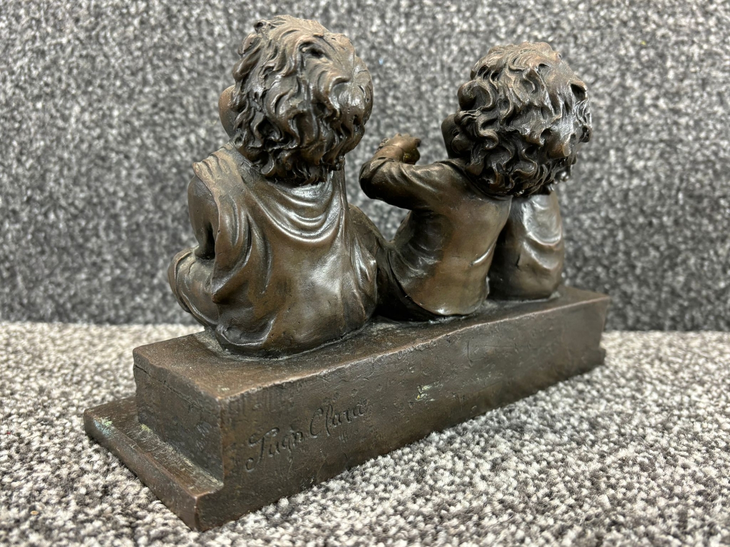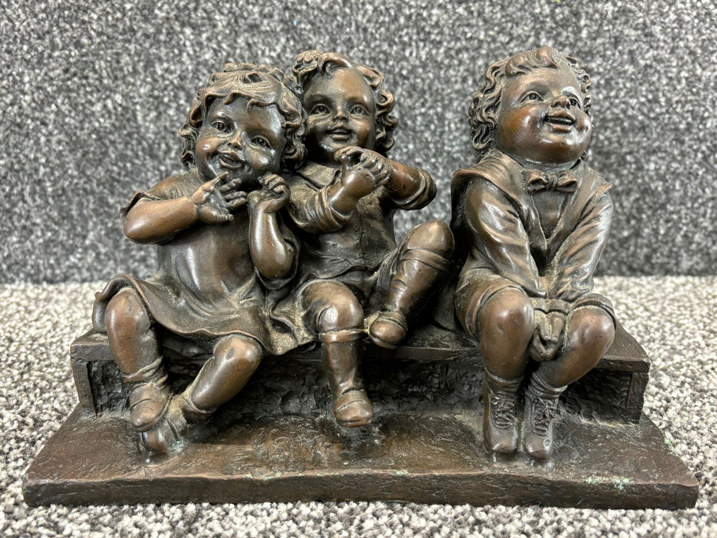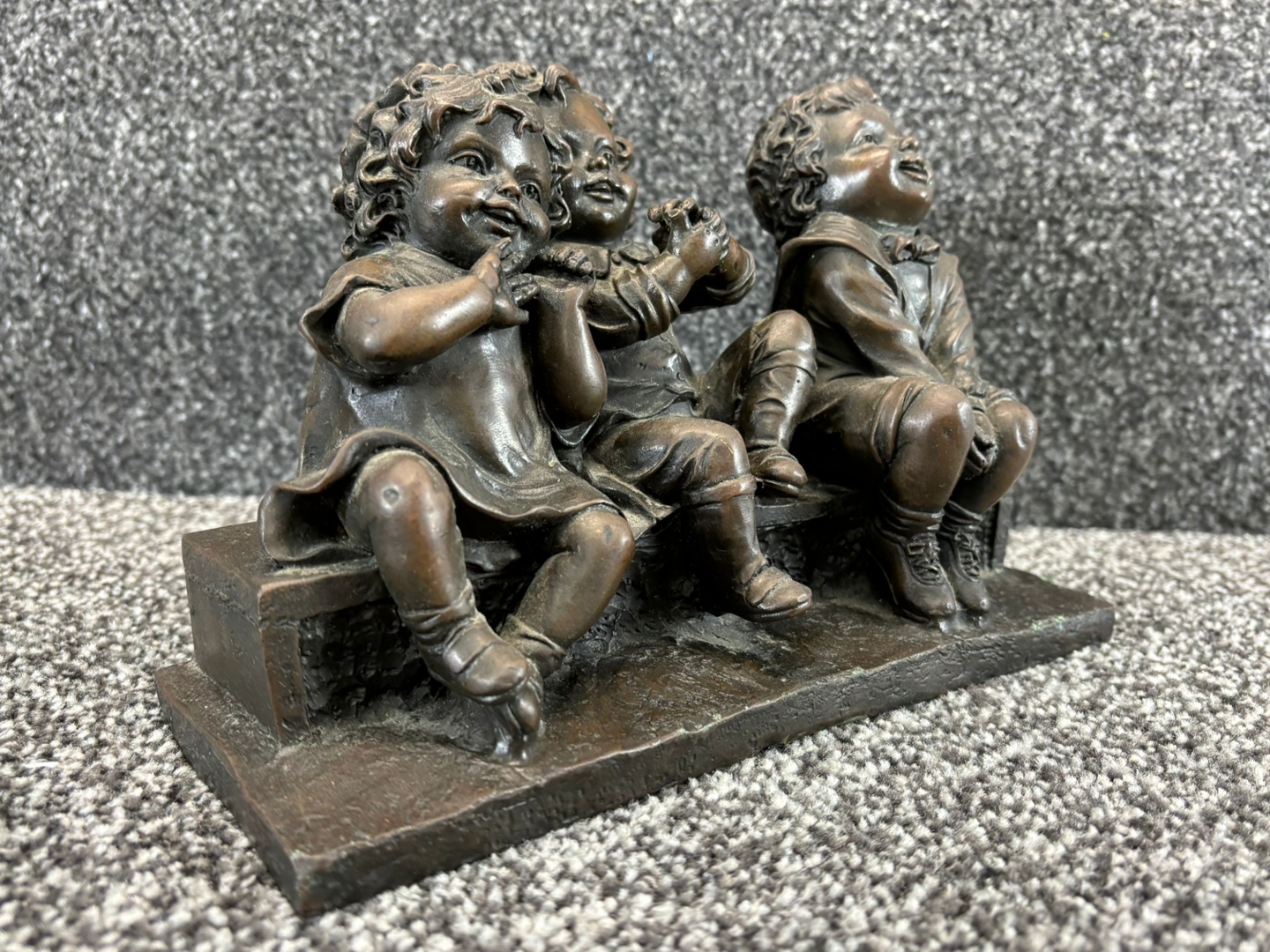 A bronze sculpture of Laughing Children. Approx 15cm height, 23cm width, 9cm depth.