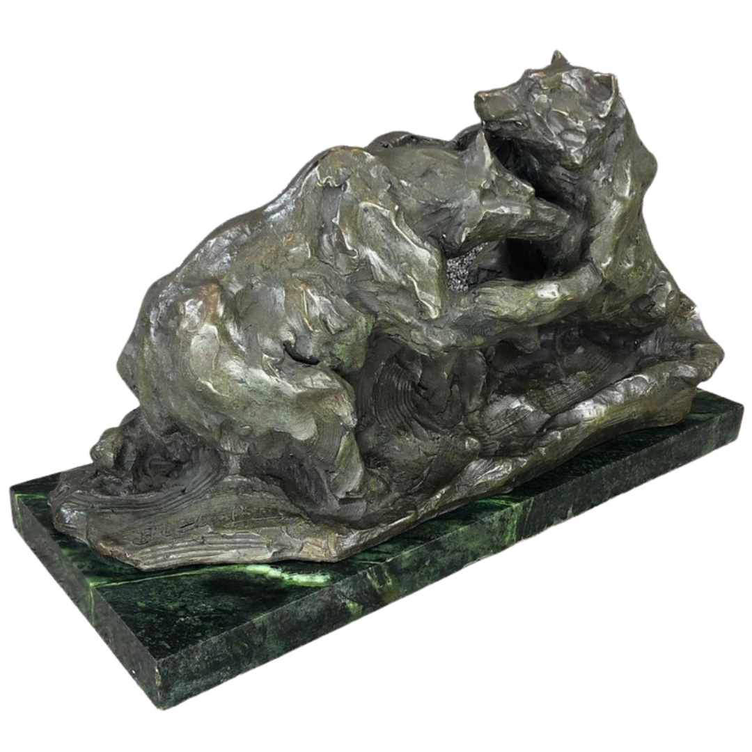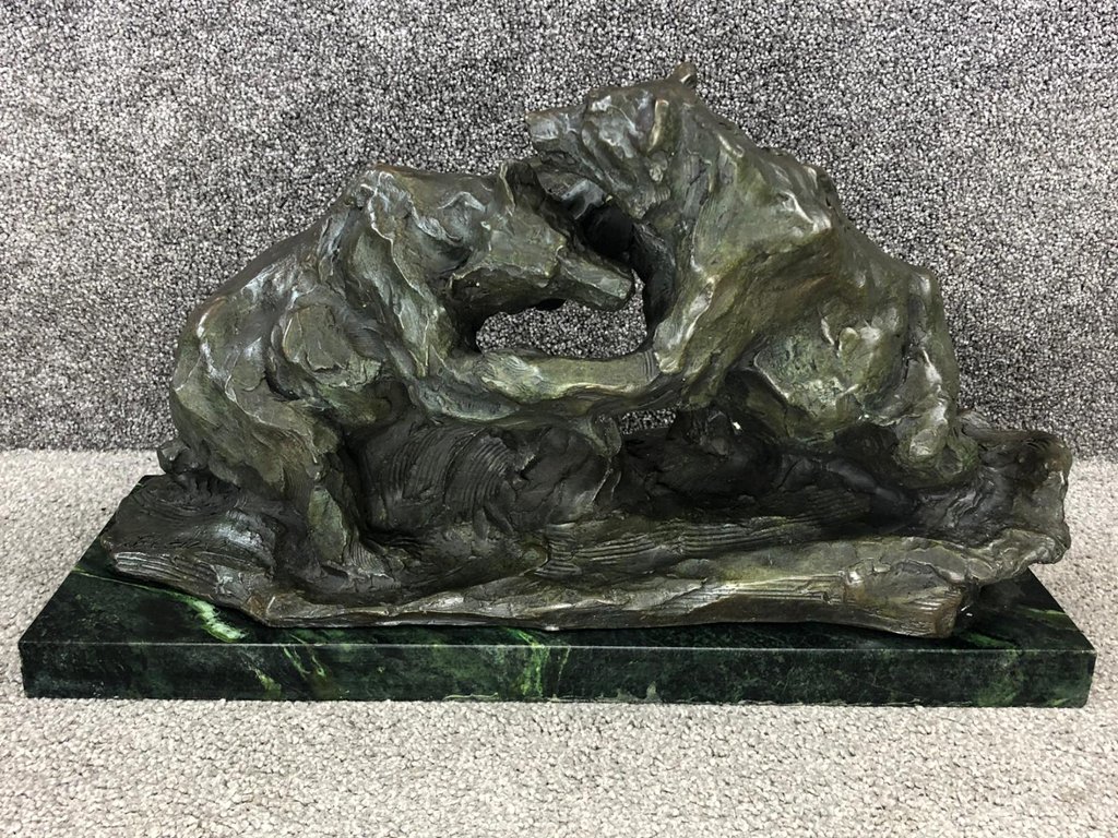 A bronze sculpture of playful Bears on a green marble base. Approx 11" height, 20" width.