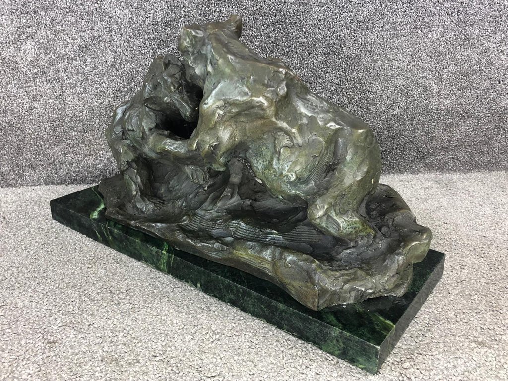 Resting on a beautifully veined green marble base, the sculpture achieves a perfect balance between rugged wilderness and refined artistry. The deep green tones of the marble complement the rich bronze patina, enhancing the overall visual depth and sophistication of the piece.