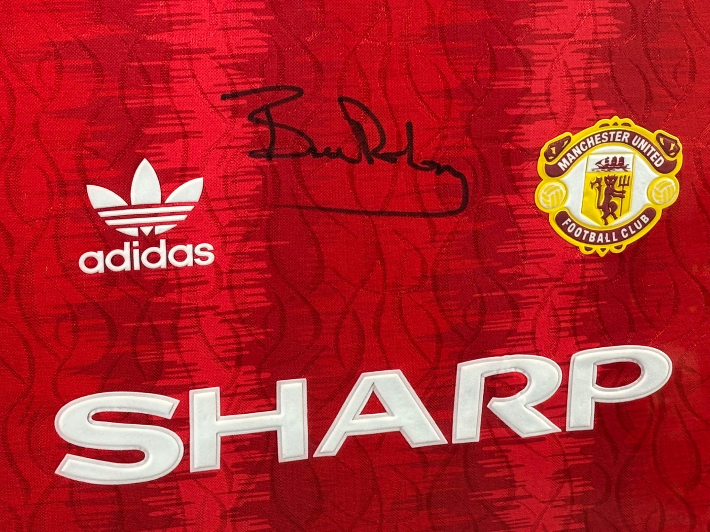 The classic red Adidas shirt, complete with the iconic Sharp sponsor logo, proudly bears Bryan Robson’s signature on the chest. Surrounding the shirt is a dynamic montage of black-and-white action shots capturing unforgettable moments from Robson’s celebrated career at Old Trafford, along with the official Manchester United crest.