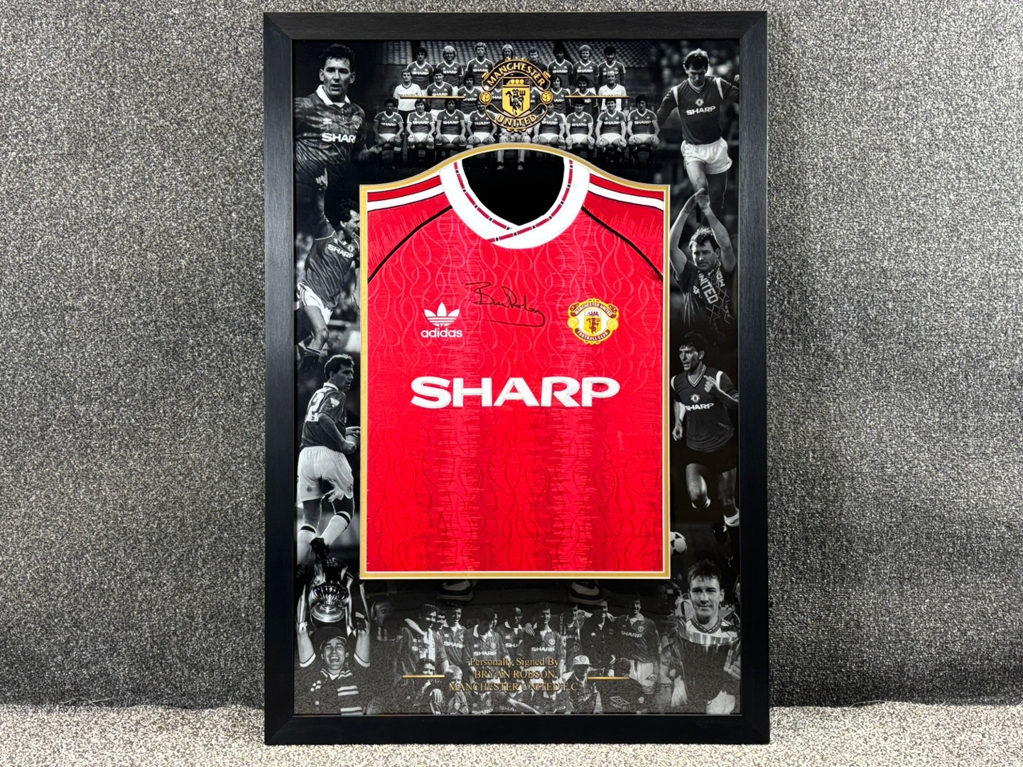 A signed and authenticated Bryan Robson Manchester United football shirt, professionally framed for display. Measuring approximately 98cm in height and 68cm in width, this remarkable piece pays tribute to one of the most influential captains in the club’s illustrious history.