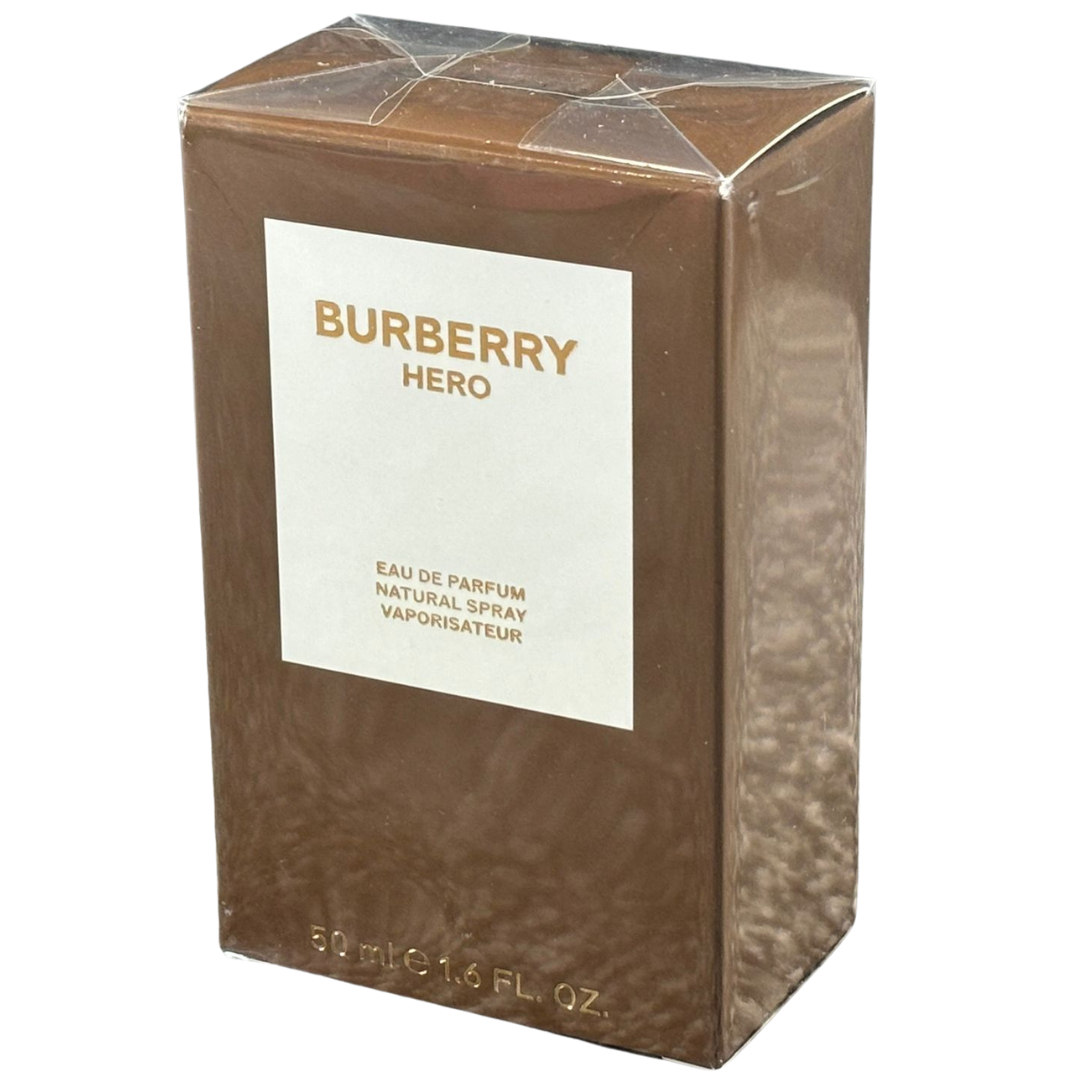 A 50ml bottle of Burberry Hero Eau De Parfum, presented in its original presentation box and capturing the modern strength and confident elegance associated with the Burberry name. This contemporary fragrance is designed to express individuality through a refined yet powerful character.