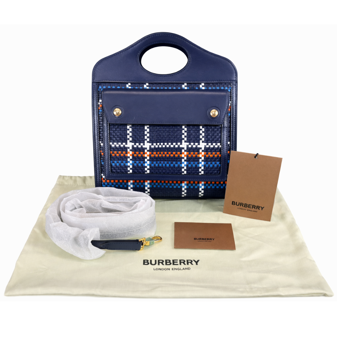 A brand new Burberry blue smooth calf leather with woven check panel Banner Top Handle bag, Approximately 26cm height, 23cm width.
