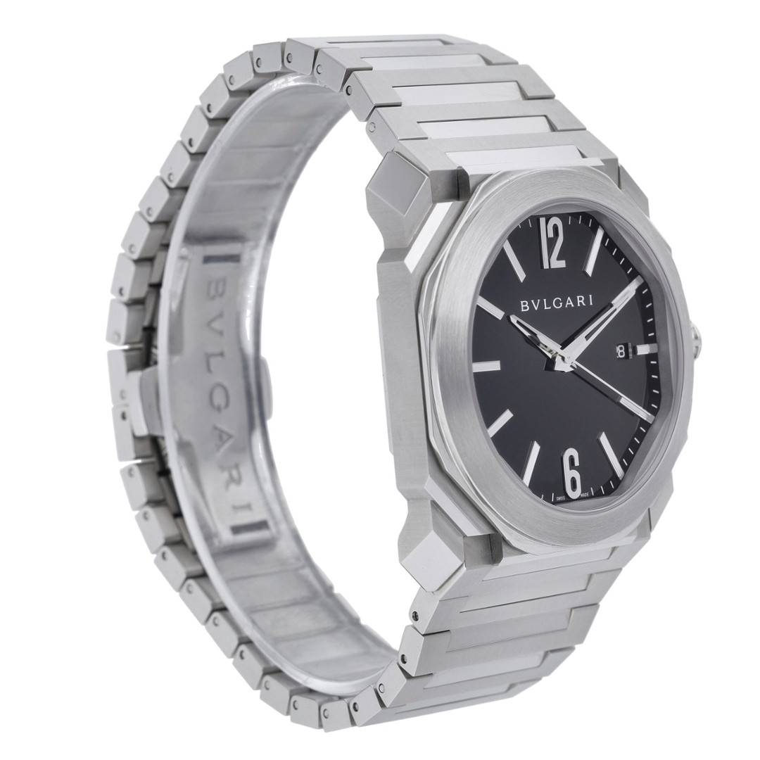 A Bvlgari Octo, model 102031, is a masterful expression of Italian design and Swiss precision. Crafted entirely from stainless steel, this striking 41mm timepiece showcases Bvlgari’s distinctive octagonal case architecture — an iconic fusion of bold geometry and refined elegance. The deep black dial, accented by applied silver indices and slender hands, exudes modern minimalism, while the discreet date display at three o’clock enhances practicality without disturbing the sleek aesthetic.