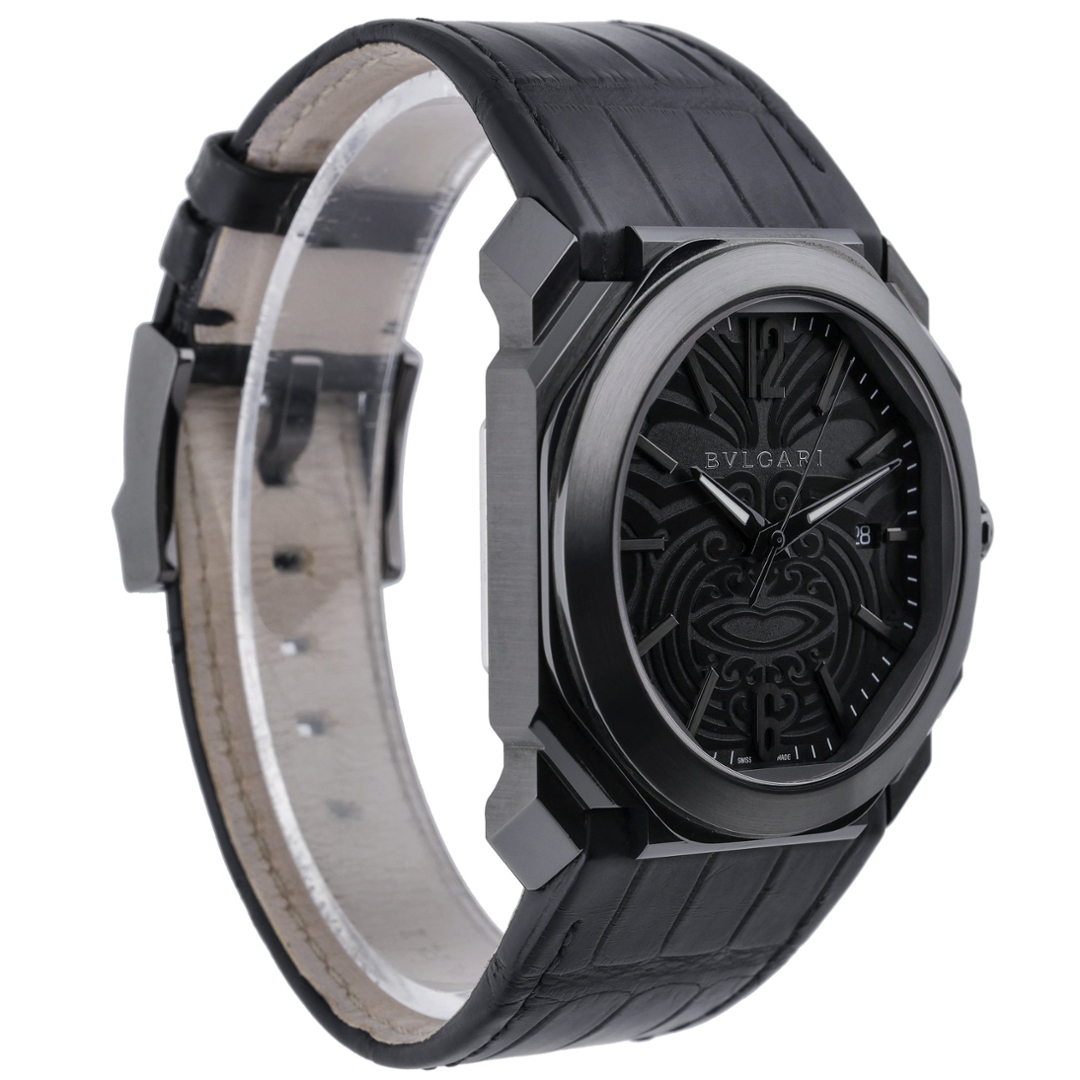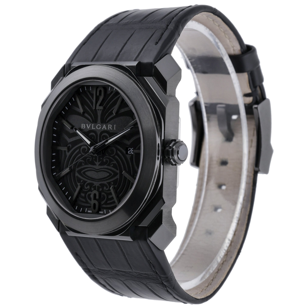 A Bvlgari Octo from 2017, this 41mm reference captures the architectural character that defines the Octo line. Its sharply faceted steel case and brushed surfaces contrast beautifully with the intensely patterned black dial, which features geometric detailing and a cleanly integrated date window. Paired with a black leather strap and steel clasp, it presents a confident, monochrome aesthetic that stands apart from traditional round-case designs.
