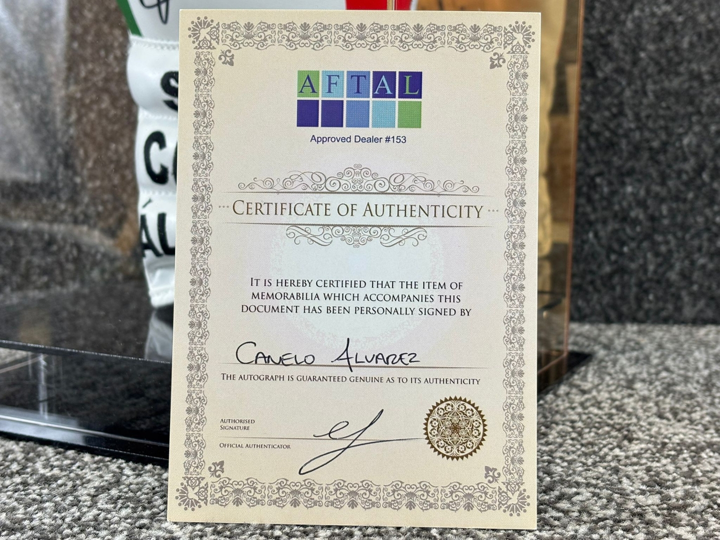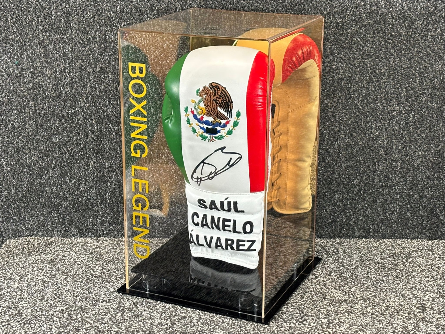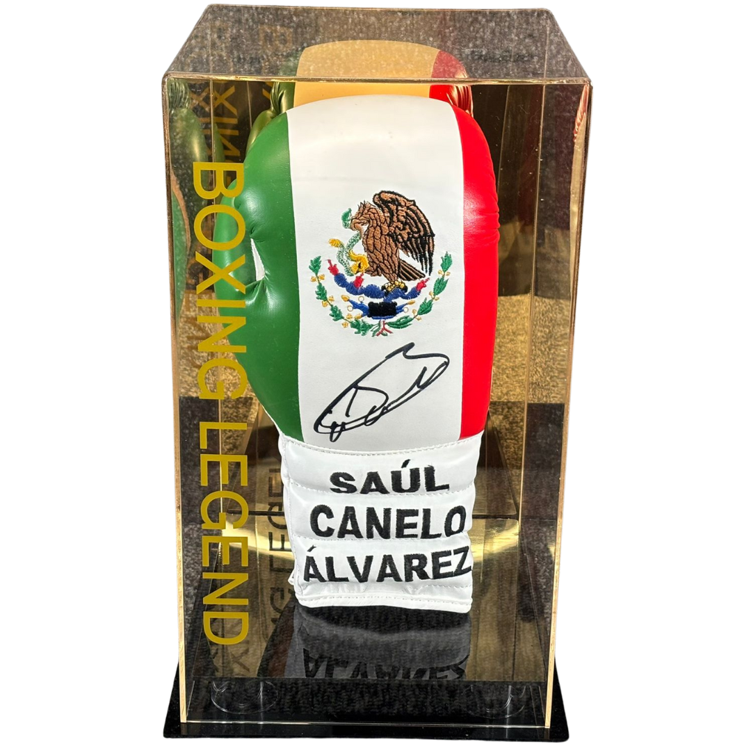 A signed and authenticated Canelo Alvarez Boxing Glove in a presentation case. Approx 15" height, 9" width.