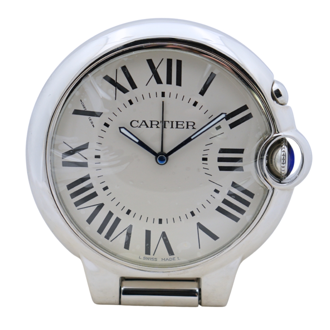Inspired by one of Cartier’s most iconic watch designs, the Ballon Bleu Desk Clock captures the same sense of refined luxury and timeless craftsmanship. Featuring a stainless steel case with Cartier’s signature rounded silhouette, this exquisite timepiece is adorned with a crisp white dial and bold black Roman numerals. The distinctive crown guard detail, a hallmark of the Ballon Bleu collection, lends the piece a contemporary yet elegant edge.