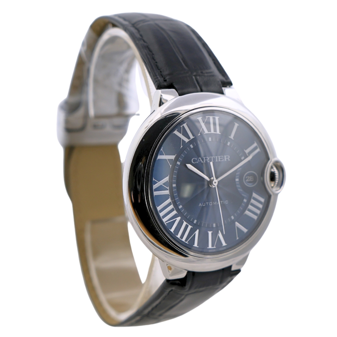 A Cartier Ballon Bleu Watch that captures the perfect balance of sophistication and modern charm. Crafted with a stainless steel 42mm case and paired beautifully with a black leather strap, this elegant timepiece showcases Cartier’s signature design flair. Its deep blue dial features classic Roman numerals, sword-shaped hands, and the distinctive integrated crown set with a blue cabochon, housed within the unique curved case design that defines the Ballon Bleu collection.