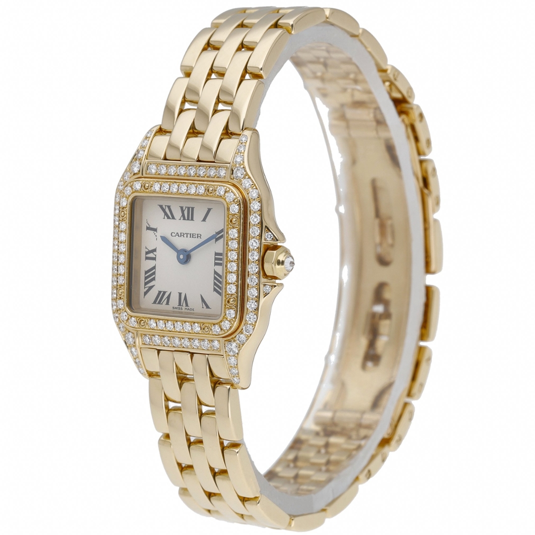 A Cartier Panthère watch crafted entirely from solid 18ct yellow gold, featuring an elegant white dial and a dazzling afterset diamond bezel that adds a touch of brilliance to this iconic design. Model number 1280, this 2001 example is powered by a precise automatic movement, combining Cartier’s timeless aesthetic with dependable performance. The 22mm case embodies the refined proportions and graceful curves that define the Panthère collection—one of the most enduring symbols of luxury and sophistication in Cartier’s history.