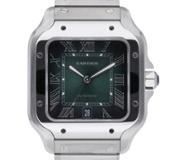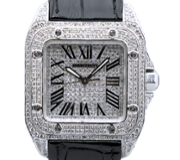The white dial showcases bold black Roman numerals, blued-steel sword hands, and the signature minute track, creating a harmonious contrast against the rich yellow gold case. The flexible linked bracelet flows seamlessly around the wrist, offering both comfort and unmistakable Cartier elegance. The afterset diamond bezel enhances the watch’s allure while maintaining its classic and wearable charm.