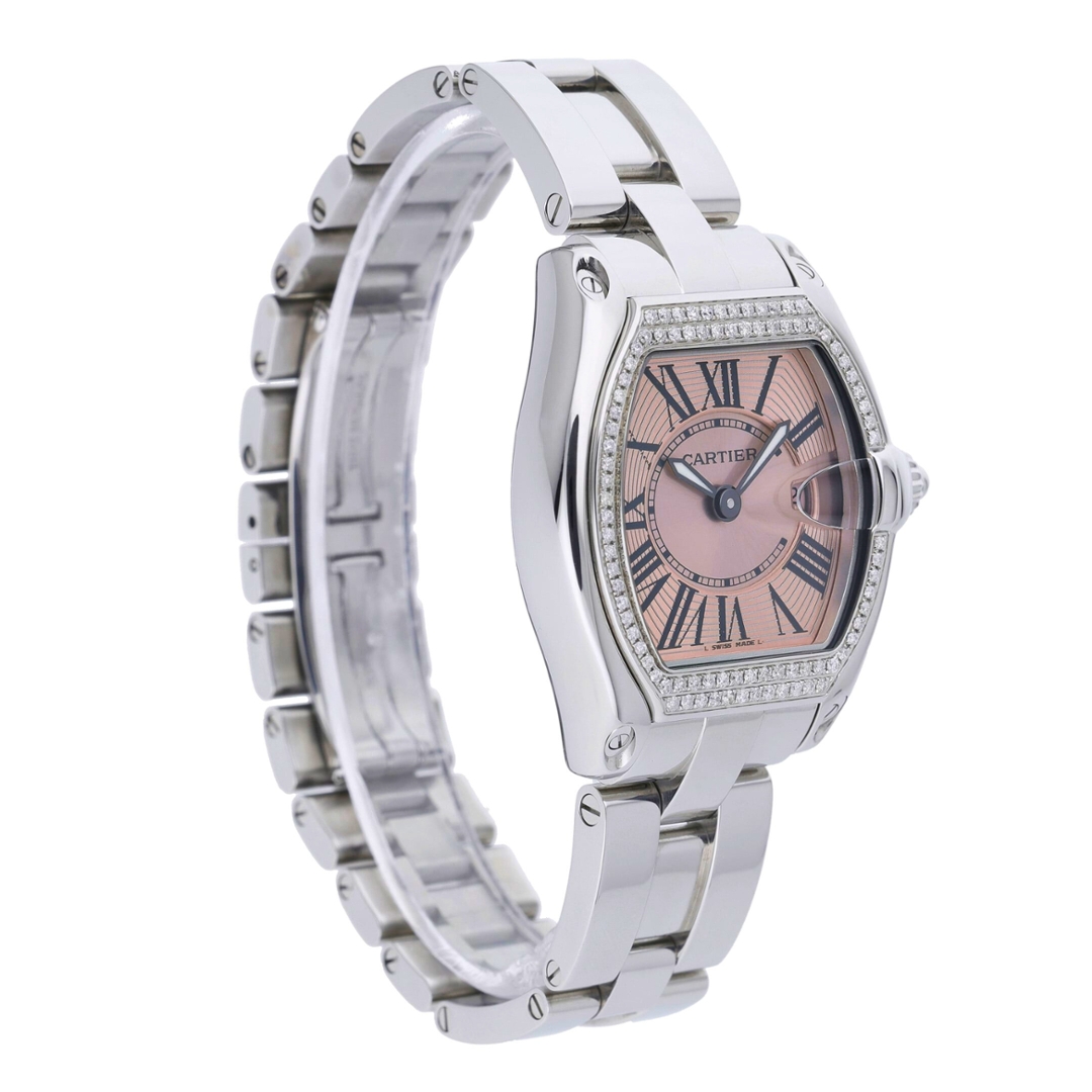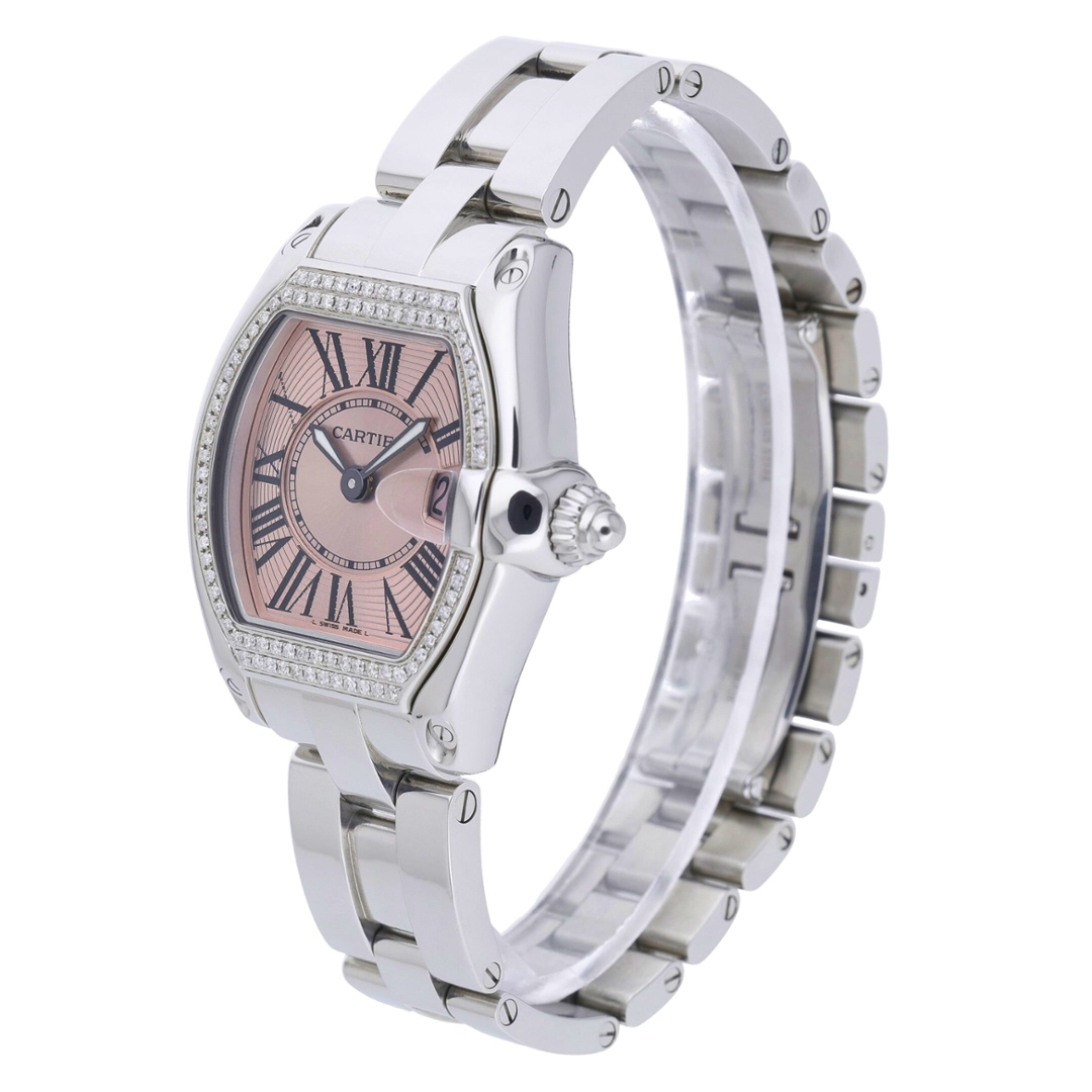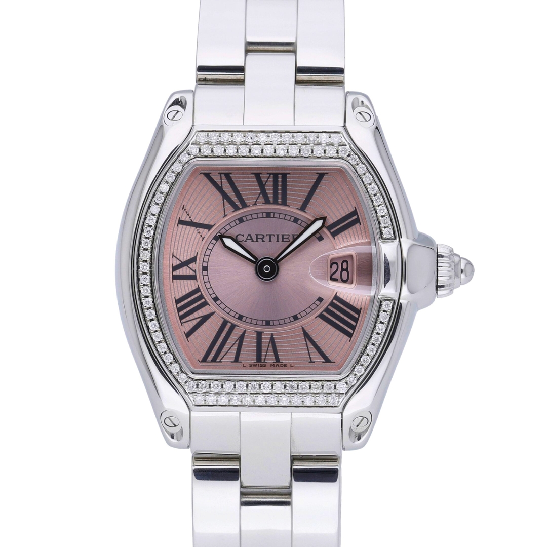 A Cartier Roadster Watch, Stainless Steel with an Afterset Diamond Bezel on a Pink Dial