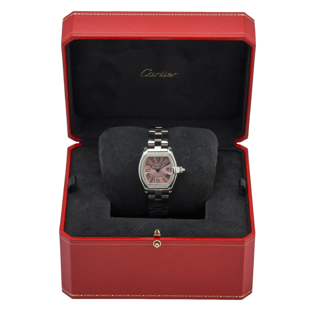 A Cartier Roadster Watch that radiates feminine elegance with a bold presence, this 2001 model 2675 offers a unique twist on a modern classic. Crafted in stainless steel with the unmistakable tonneau-shaped 31mm x 37mm case, this version is elevated by an exquisite after-set diamond bezel, adding brilliant sparkle and glamour to the iconic Roadster silhouette.