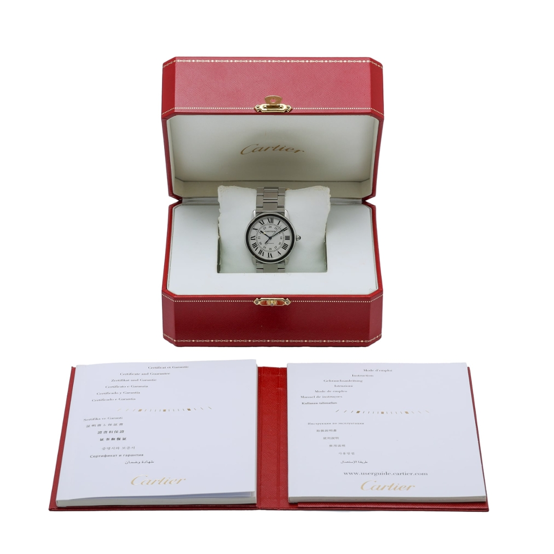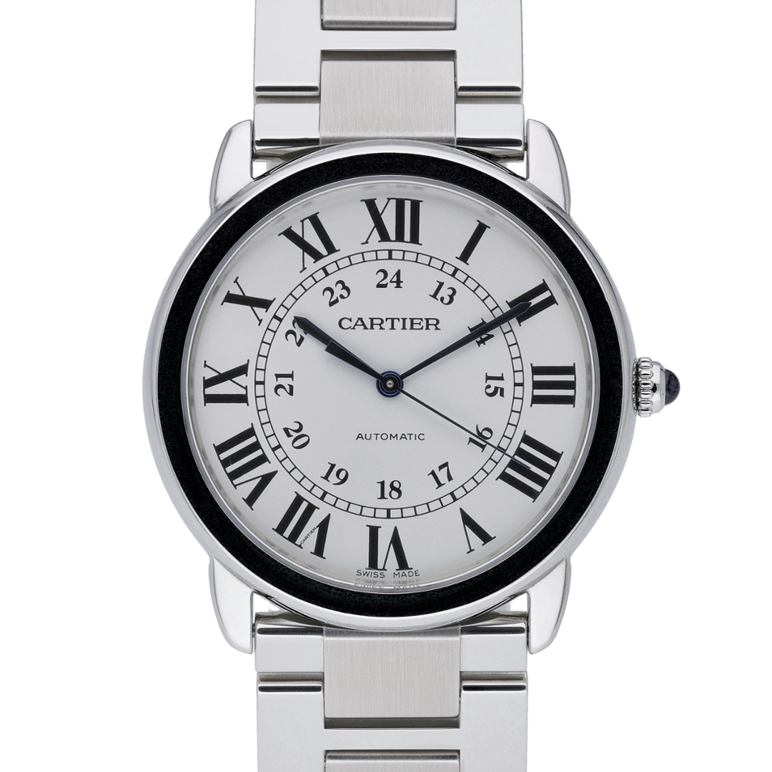 A Cartier Ronde Solo is a refined and understated expression of the brand’s classic design language, presented here in a 36mm stainless steel case that sits comfortably on the wrist. The clean white dial features bold black Roman numerals, a railway minute track, and blued steel sword hands, delivering immediate recognition and timeless appeal. A central 24-hour inner track adds subtle visual interest while maintaining excellent legibility.
