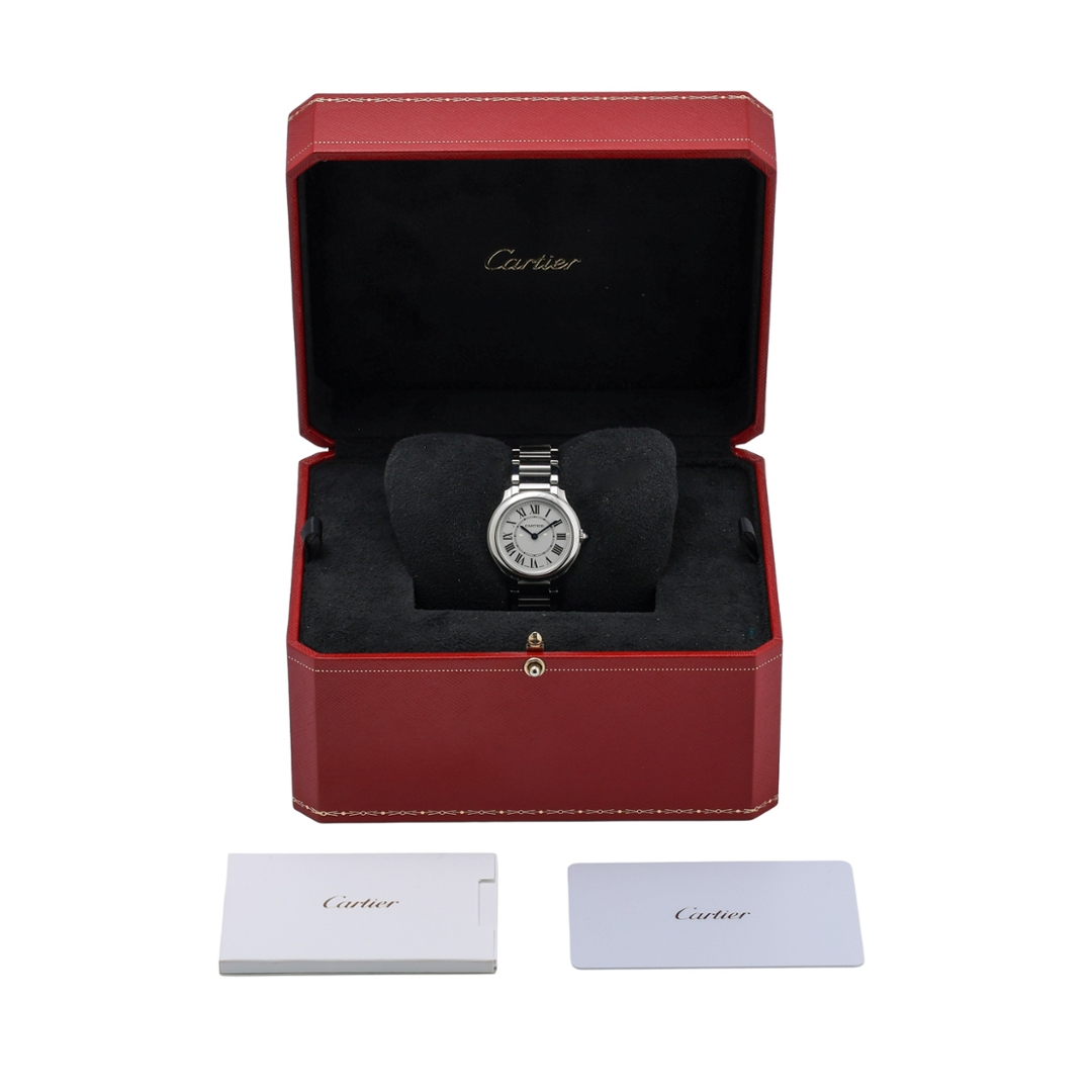 A Cartier Ronde Solo watch, reference WSRN0033, crafted in stainless steel and presented on a matching Cartier bracelet. The elegant 29mm round case embodies Cartier’s refined design language, featuring smooth, flowing lines and the maison’s signature sapphire cabochon crown. The silvered dial features bold black Roman numerals, a delicate railway minute track, and striking blued-steel sword hands, delivering the timeless aesthetic that has defined Cartier dress watches for generations.