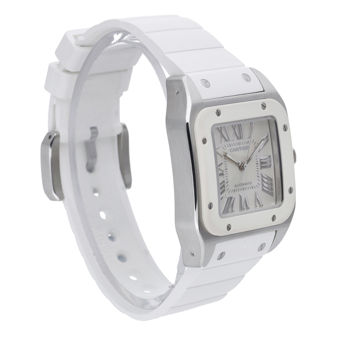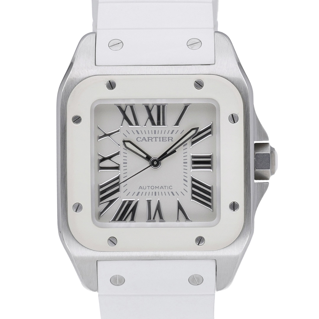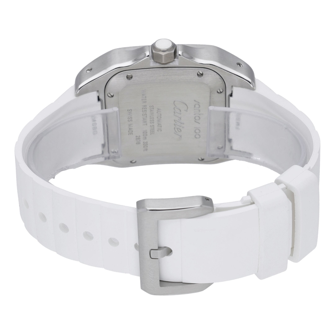 A Cartier Santos 100 Watch, White Strap with a Stainless Steel Case & Clasp on a White Dial