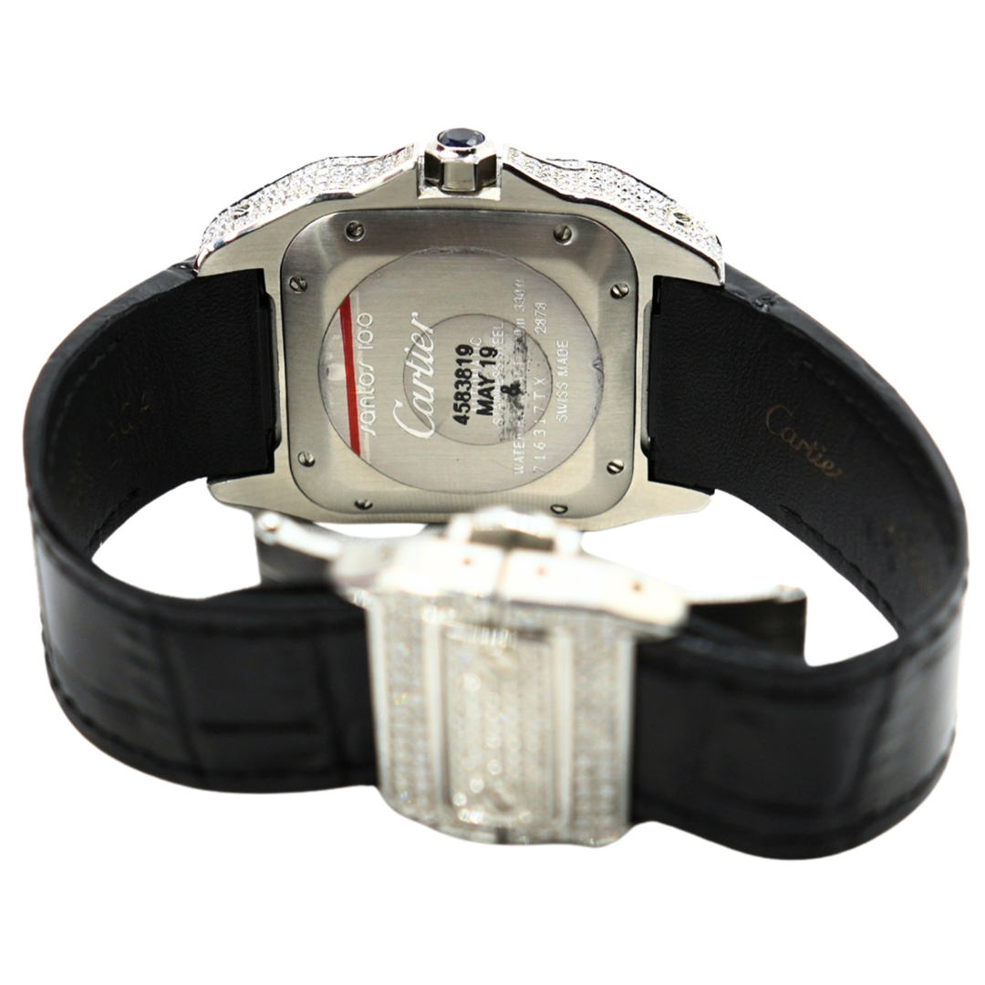 A Cartier Santos 100 2878 pairs timeless design with a dazzling modern upgrade. The stainless steel case, bezel, clasp, and dial are all meticulously set with brilliant afterset diamonds, creating an unforgettable presence on the wrist. Roman numeral hour markers and Cartier’s signature square design keep the classic Santos DNA intact, while the black leather strap adds an elegant contrast to the diamond brilliance.