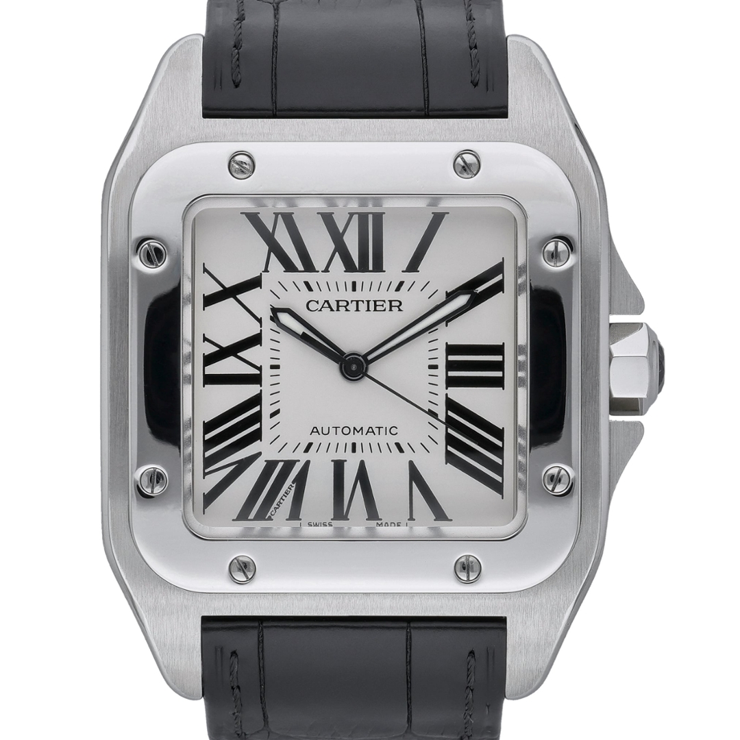 A Cartier Santos 100, presented on a black leather strap and housed in a stainless steel case, showcases one of the most iconic square watch designs in modern horology. The silvered-white dial is defined by bold black Roman numerals, a chemin de fer minute track, and classic blued-steel sword hands, delivering unmistakable Cartier styling. The signature exposed screws on the bezel and the integrated case design reinforce the Santos identity, offering a refined yet instantly recognisable presence on the wrist.