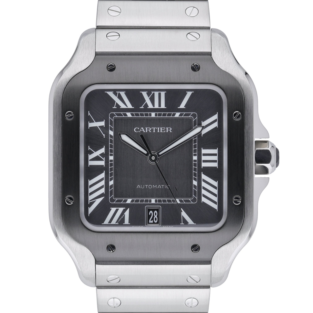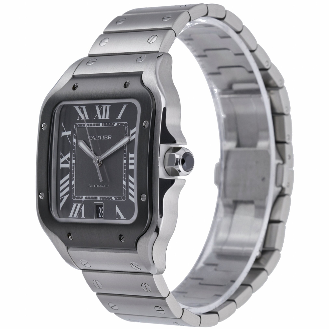 A Cartier Santos De Cartier Watch, Stainless Steel with a Black Bezel and a Grey Dial.