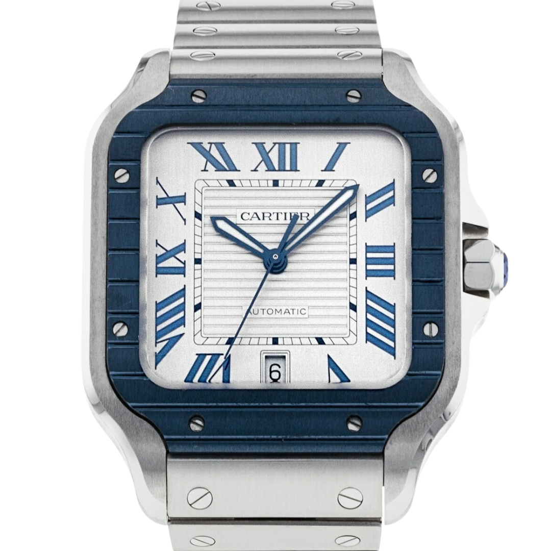 A Cartier Santos de Cartier, reference WSSA0047, presented in immaculate condition and offered as a complete, investment-worthy set. Crafted in stainless steel with the distinctive blue bezel, this 39mm model features the classic silvered white dial with blue Roman numerals and sword hands, powered by a reliable automatic movement. Supplied with the integrated steel bracelet and the original interchangeable blue rubber strap, it delivers both versatility and everyday wearability.