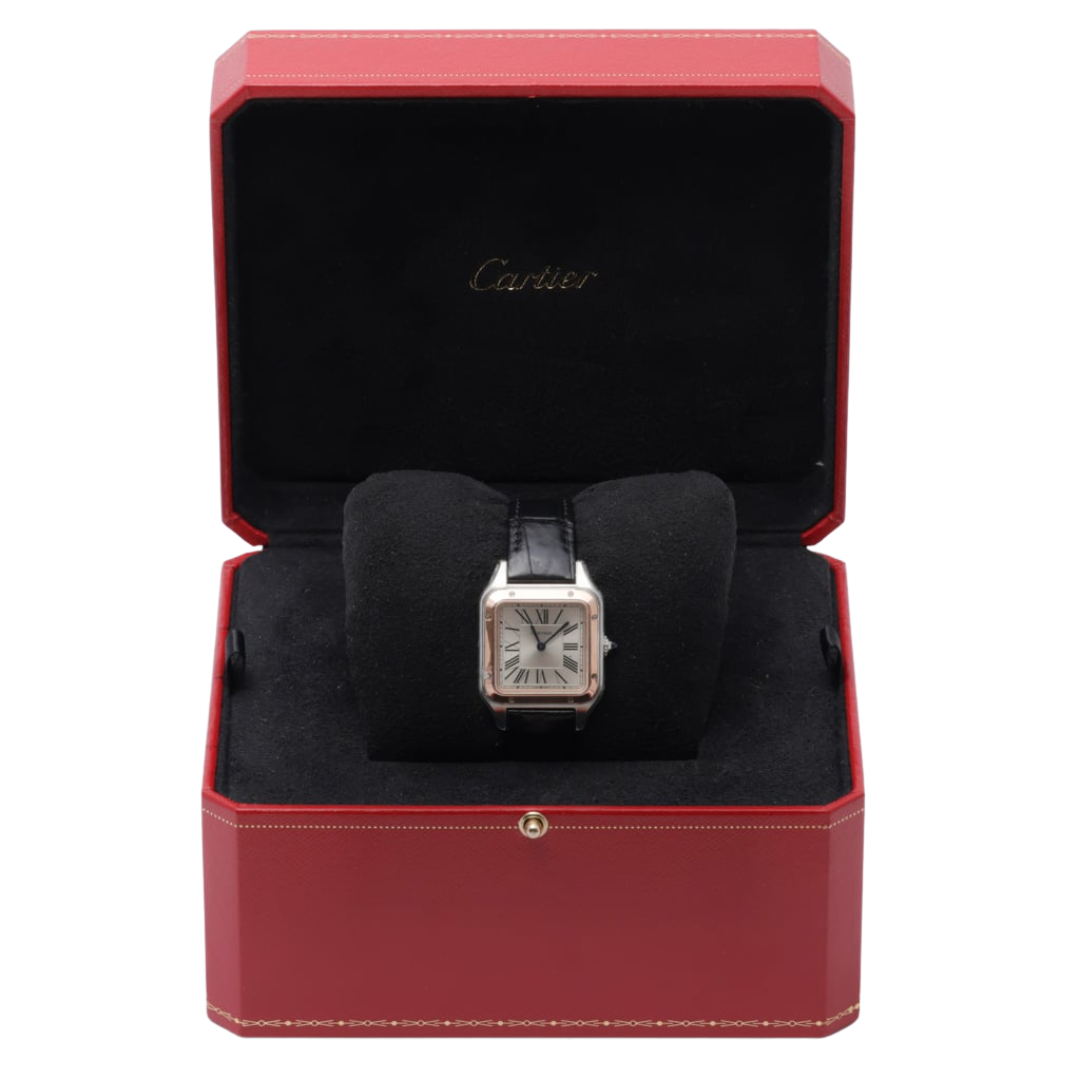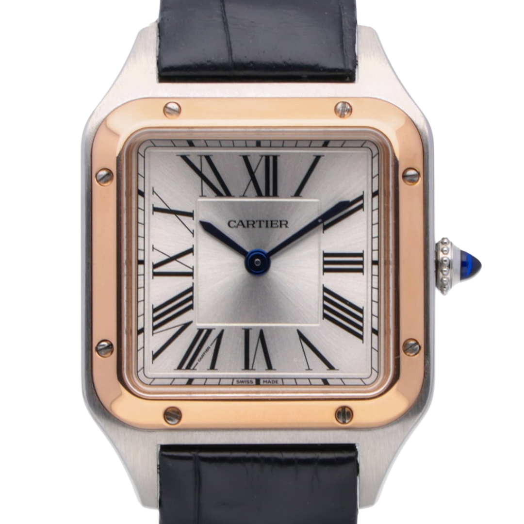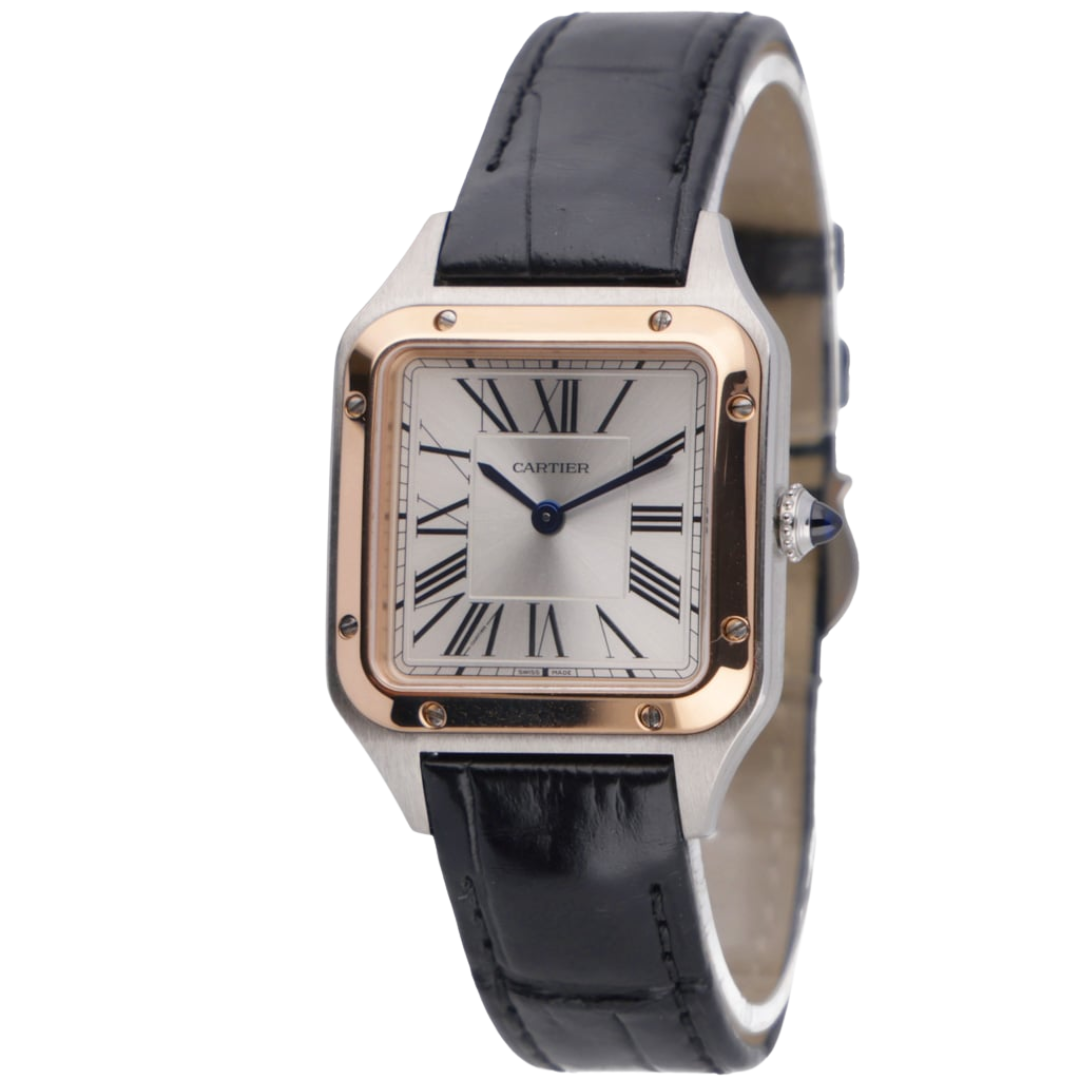 A Cartier Santos-Dumont watch in stainless steel and 18ct rose gold, featuring the brand’s instantly recognisable square case and an elegant silver dial with classic black Roman numerals. Blued steel hands and the signature blue cabochon crown complete the refined aesthetic, paired with a black leather strap for a timeless, dress-focused finish.