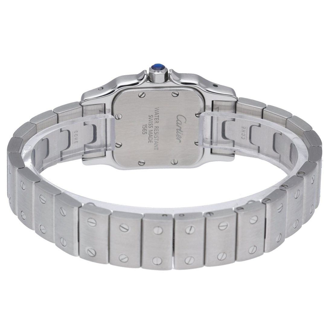 The 24mm square case is complemented by the iconic exposed screw bezel and matching steel bracelet, both hallmarks of the Santos line’s aviation-inspired heritage. Powered by a precise quartz movement, the watch delivers effortless reliability while maintaining its timeless aesthetic appeal.