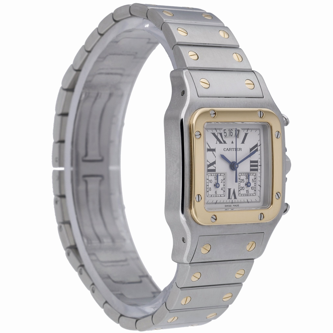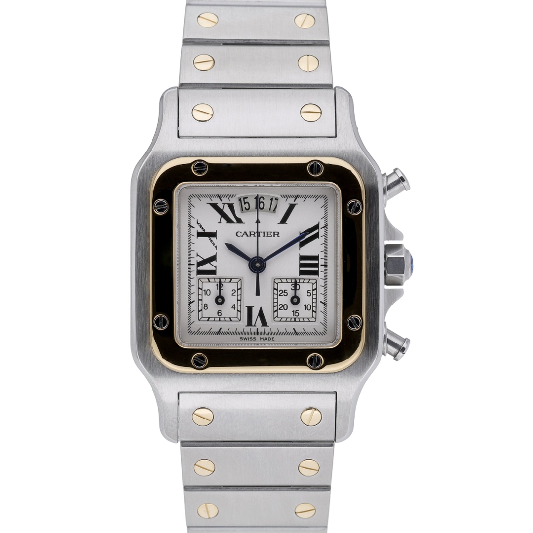 A Bi-Metal Cartier Santos Galbée Chronograph, model 2425, beautifully combines refined Parisian elegance with mechanical precision. Crafted from stainless steel and 18ct yellow gold, this sophisticated timepiece features the signature square case with exposed screws and a contrasting yellow gold bezel that frames the crisp white dial. The dial is adorned with black Roman numerals, blued-steel hands, and two sub-dials positioned at three and nine o’clock, capturing Cartier’s perfect balance between form and function.