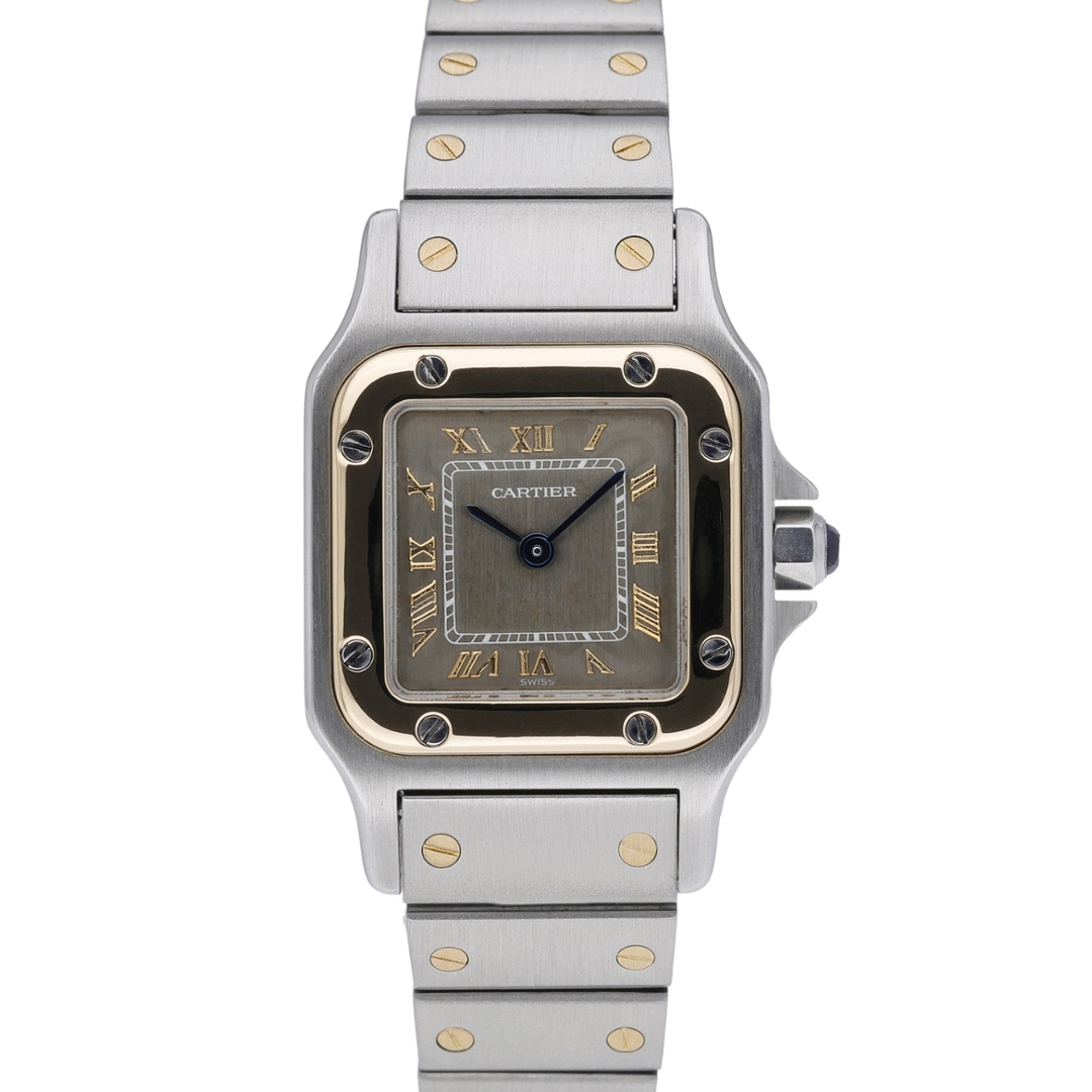 A Cartier Santos Galbée in bi-metal stainless steel and 18ct yellow gold, presenting a refined and highly recognisable interpretation of one of Cartier’s most iconic designs. The compact square case is framed by the signature exposed screws, mirrored throughout the bracelet for a cohesive and unmistakably Cartier aesthetic. This example features a distinctive grey dial, accented with gold-tone Roman numerals and a subtle inner minute track, paired with elegant blued steel hands and a classic cabochon-set crown, delivering a sophisticated, slightly more contemporary variation of the traditional Santos look.