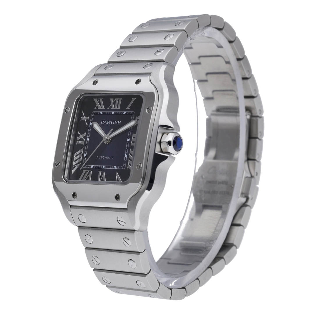 A Cartier Santos de Cartier Medium reference WSSA0063 features an iconic stainless steel square case, paired with a rich blue sunray dial that highlights Cartier’s signature Roman numerals and sword-shaped hands. The integrated bracelet and exposed bezel screws reinforce the model’s architectural identity, while the blue cabochon crown adds a refined finishing touch. At 35mm, this version offers balanced proportions that sit comfortably on the wrist without sacrificing presence.