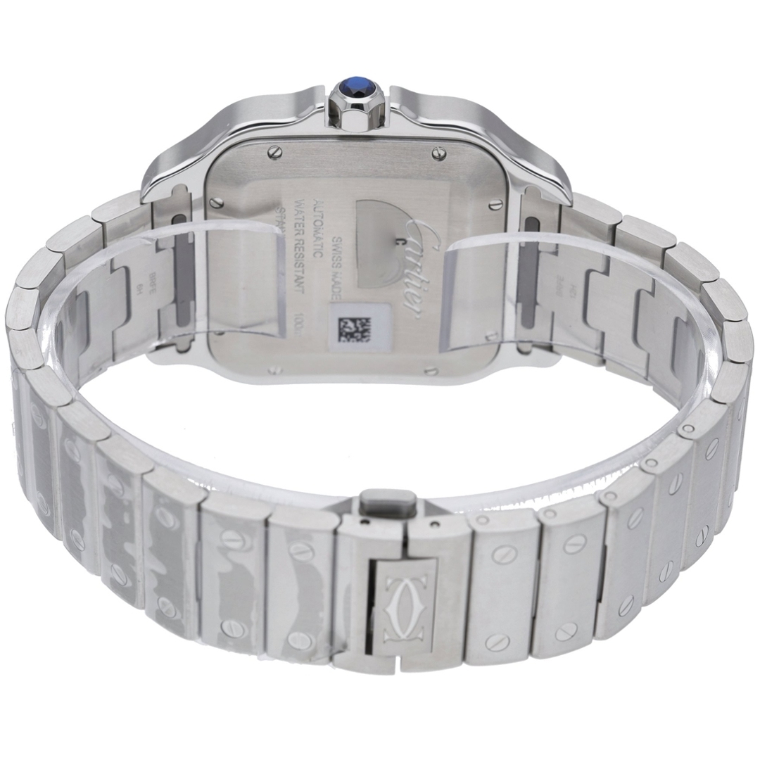 A Cartier Santos watch crafted in stainless steel, featuring a striking green sunray dial that brings a modern and luxurious twist to this legendary design. Model number WSSA0062, this 2025 example is powered by Cartier’s in-house Calibre 1847 MC automatic movement, known for its precision, reliability, and robust anti-magnetic construction. The 39.8mm case retains the signature square shape and exposed screw detailing that have made the Santos an enduring icon since its creation in 1904.