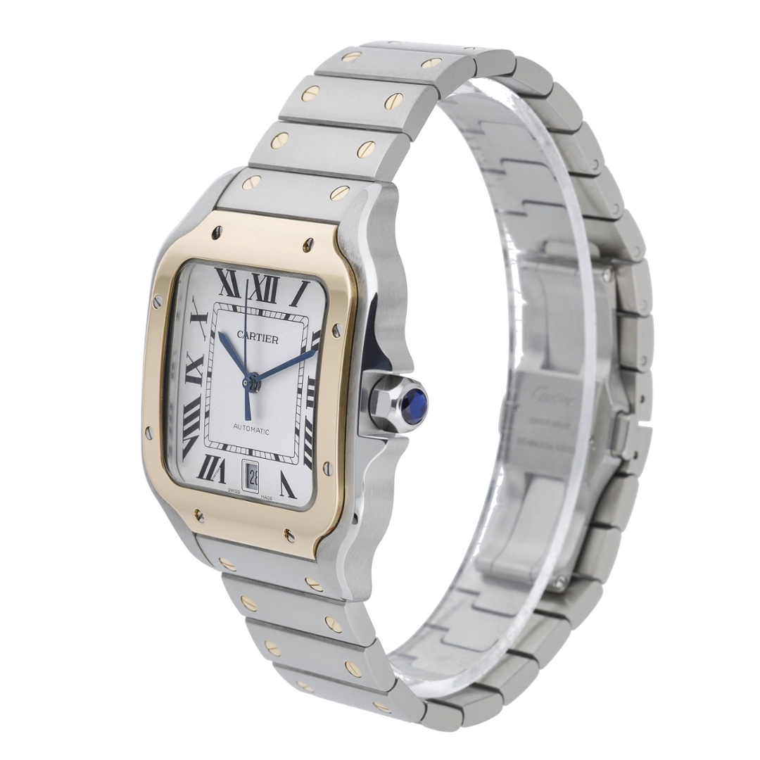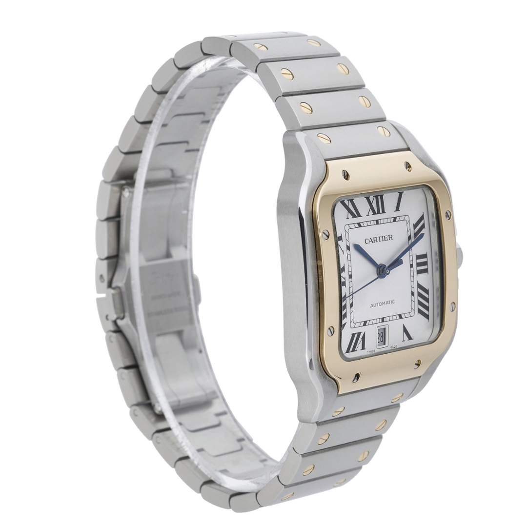 A bi-metal Cartier Santos offers a refined blend of stainless steel and 18ct yellow gold, presenting one of Cartier’s most recognisable and enduring designs in immaculate condition. The squared case with exposed screws retains its unmistakable heritage aesthetic, while the yellow-gold bezel adds a warm contrast that elevates the watch's clean geometry. The white dial, featuring bold Roman numerals and Cartier’s signature blued-steel hands, delivers perfect legibility and an unmistakably Parisian elegance that has defined the Santos for over a century.