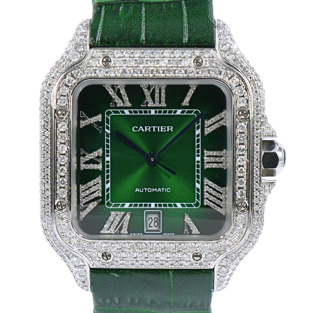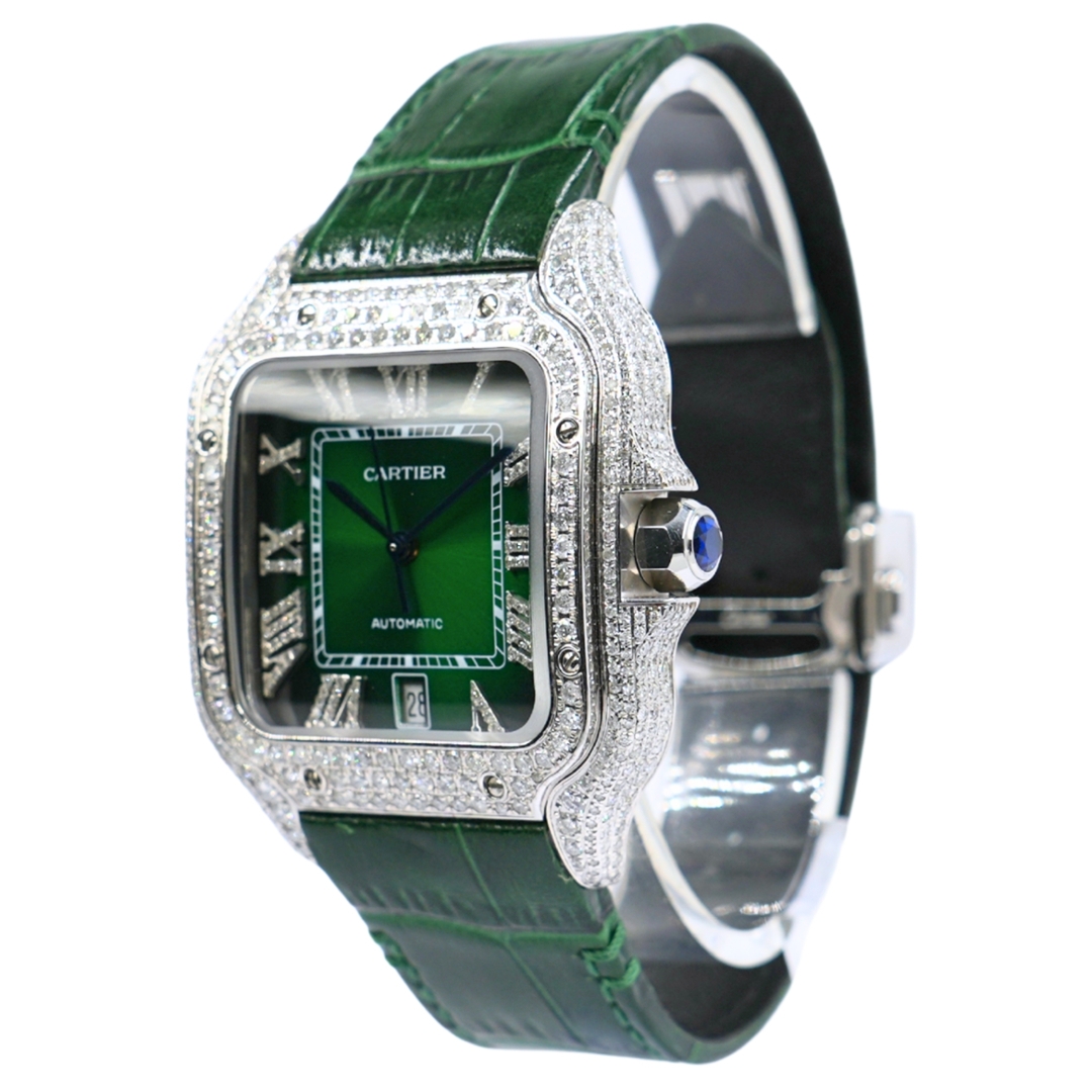 A Cartier Santos Watch, Green Leather Strap with an Afterset Diamond case and dial.