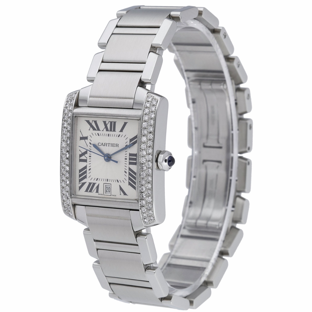 A Cartier Tank Francaise Watch, Stainless Steel with a Diamond Bezel on a White Dial