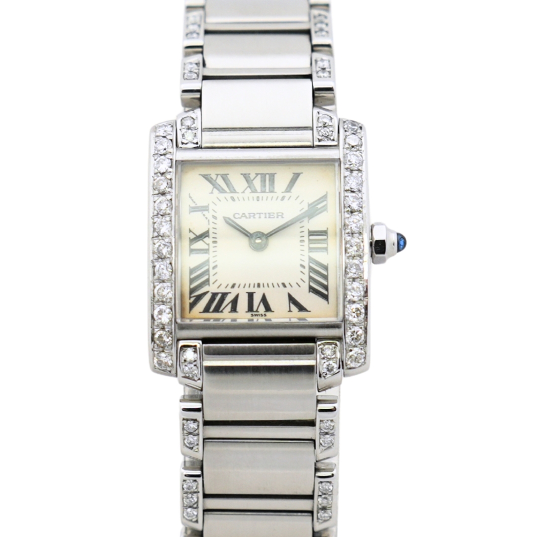 A Cartier Tank Francaise Watch, Afterset Diamond-Lined Bracelet and Bezel on a White Dial.