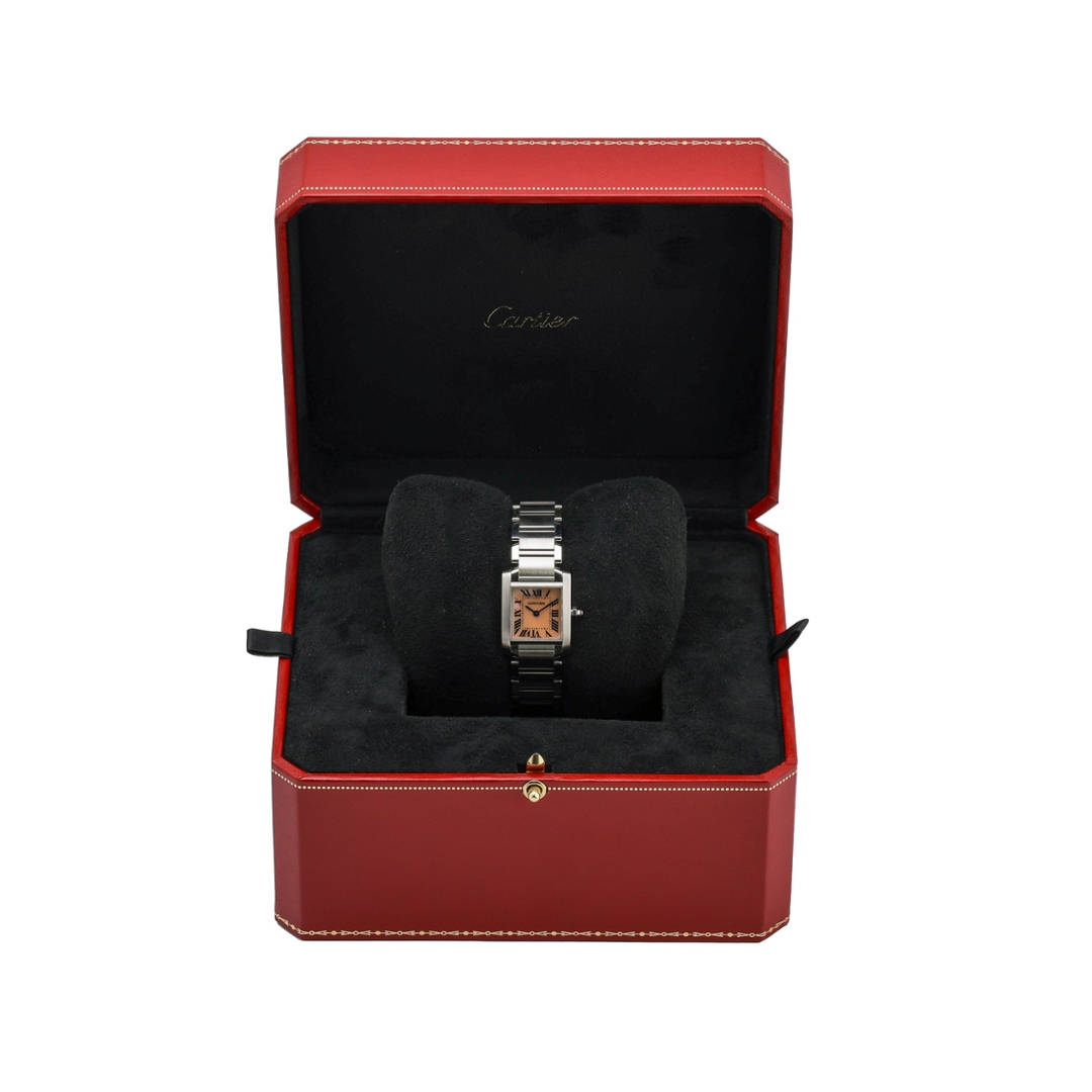Powered by a Quartz movement, the Tank Française provides reliable timekeeping with the precision for which Cartier is renowned. Its immaculate condition reflects careful preservation, and the watch’s classic design ensures it will remain a sought-after piece for years to come. Whether worn for everyday use or special occasions, this Cartier watch exudes sophistication and style, making it an ideal addition to any collection.