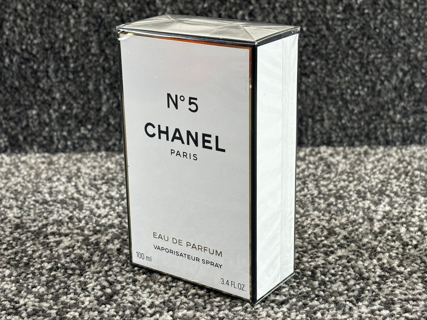 A 100ml bottle of Chanel No. 5 Eau de Parfum, presented in its original Chanel presentation box, offering one of the most iconic and recognisable fragrances in the world. The timeless bottle design showcases the elegance and refinement that define the Chanel house, making this an exceptional choice for gifting or elevating any personal perfume collection.