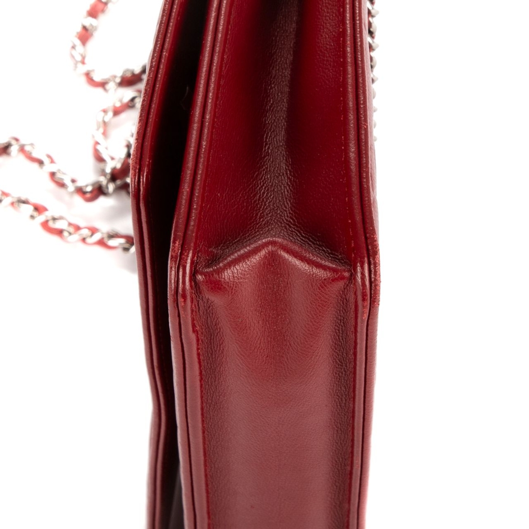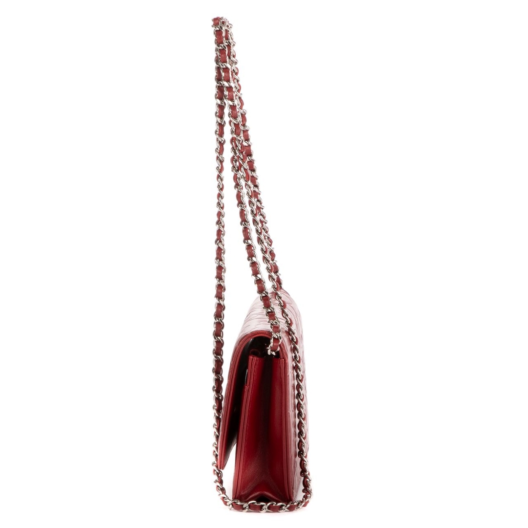 Measuring approximately 12.4cm in height and 19cm in width, this piece is perfectly sized to carry essentials while maintaining a slim, streamlined profile. The flap closure offers secure storage, and the structured silhouette ensures it holds its shape during wear. Its deep red hue adds richness and versatility, making it a striking yet wearable accessory for day or evening.
