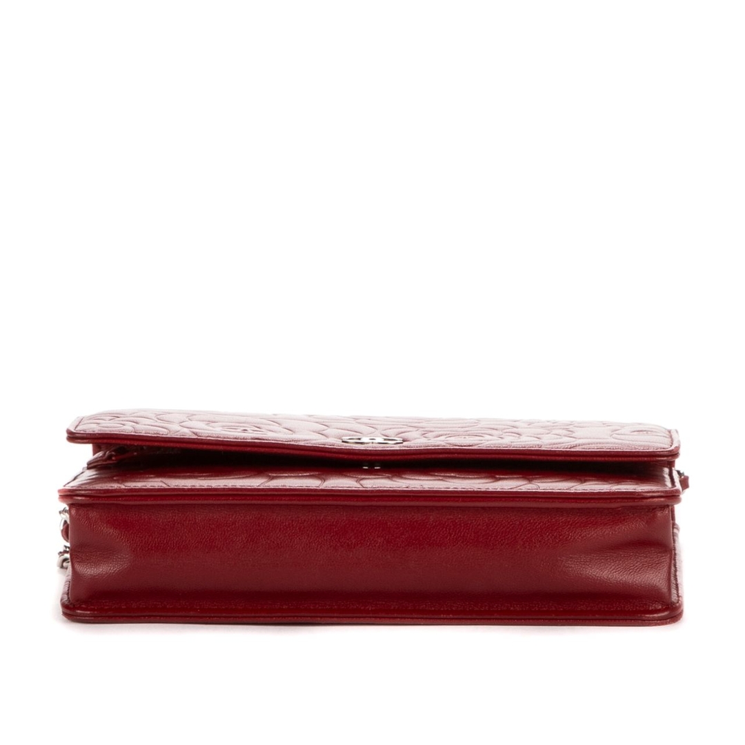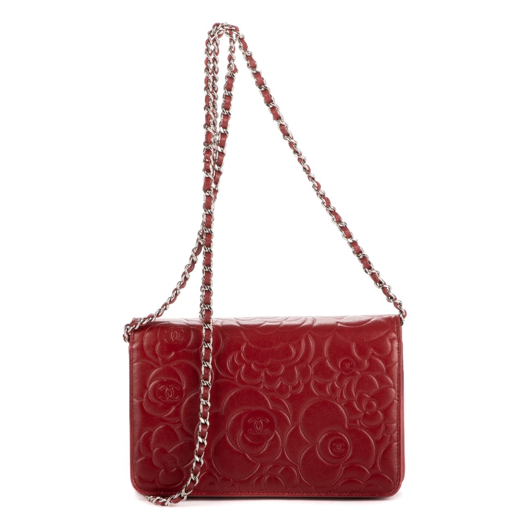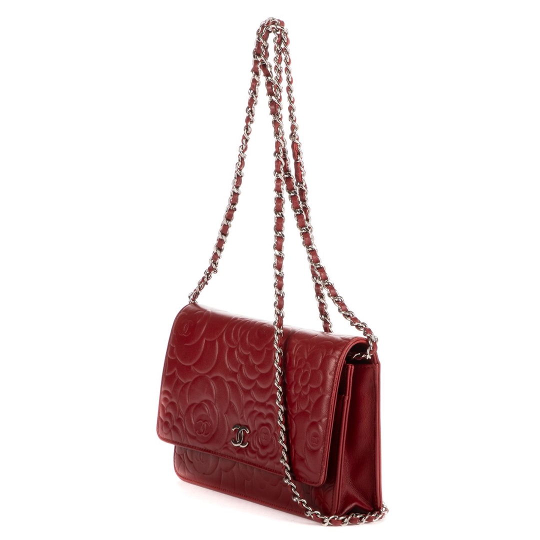 A vintage dark red calf leather Chanel Camelia Wallet on Chain, complete with a certificate of authenticity, distinguished by its elegant floral embossing. Crafted from supple calf leather, the design features Chanel’s signature camellia motif across the flap, creating a textured and feminine appeal. The front is adorned with a small, understated interlocking CC emblem in silver-tone hardware, harmonising beautifully with the matching leather-threaded chain strap.